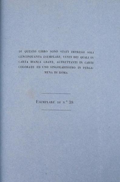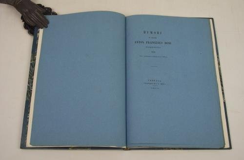 Cm. 25, pp. xvi, 42 (6). Legatura coeva in mezzo marocchino a fascia larga e con ampie punte. Sguardie marmorizzate e taglio di testa dorato. Esemplare molto marginoso ed in ottimo stato di conservazione. Edizione di sole 150 copie numerata; il nostro è il n. 38 fa parte della tiratura di 20 copie stampate interamente su carta azzurra. Cfr. Papanti I, 143; Passano 191. Si tratta della prima edizione di questa raccolta di 14 storie o aneddoti raccolti dal Doni nel 1550 ma che rimasero inediti. Nelle carte preliminari appare la dedica di Andrea Tessier al Bongi ed un'introduzione di Vincenzo Lazar in cui si traccia la storia del manoscritto che è tutt'ora conservato al Museo Correr di Venezia.