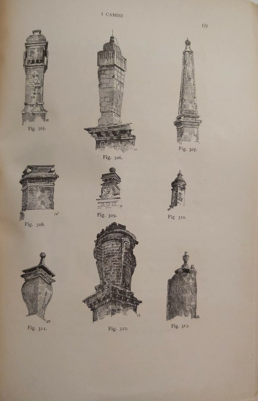 in-8 gr., pp. 69, (6), rileg. mod. m. perg. con doppio tass. al d. con nervi, angoli, piatti in cart. marmorizz. Antip. fig. Interess. e non comune studio sui centinaia di particolari camini e comignoli veneziani, con ricco apparato iconografico che ne mette in evidenza le tipologie attraverso i secoli. Raro. Ottimo esempl. [344]