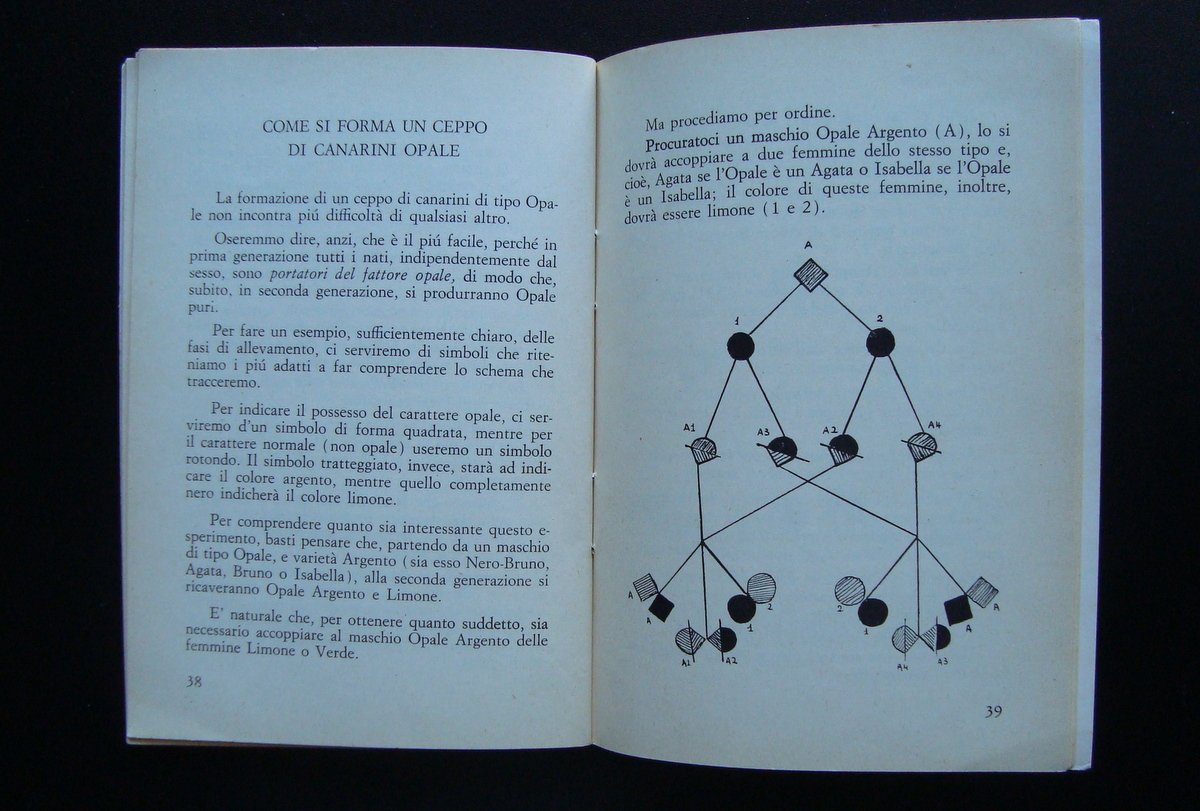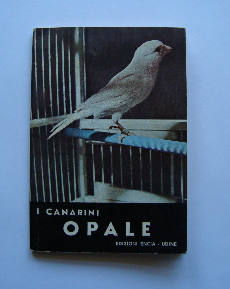 Brossura, I CANARINI OPALE Ed. Encia, Udine, s.d., cm 10,5x15,5, pp. 52; brossura ed. con molti disegni e due ill.fot.in t. Copertina fotografata da Teodoro Cappabianca. Condizioni di conservazione. Esemplare in buono stato con leggere tracce d'uso e del tempo, brossura post. con qualche brunitura, interni buoni. In copertina magnifico Opale Isabella Argento, dall'allevamento di padre Nazario Vallerino di Genova OPEB.4080 blu
