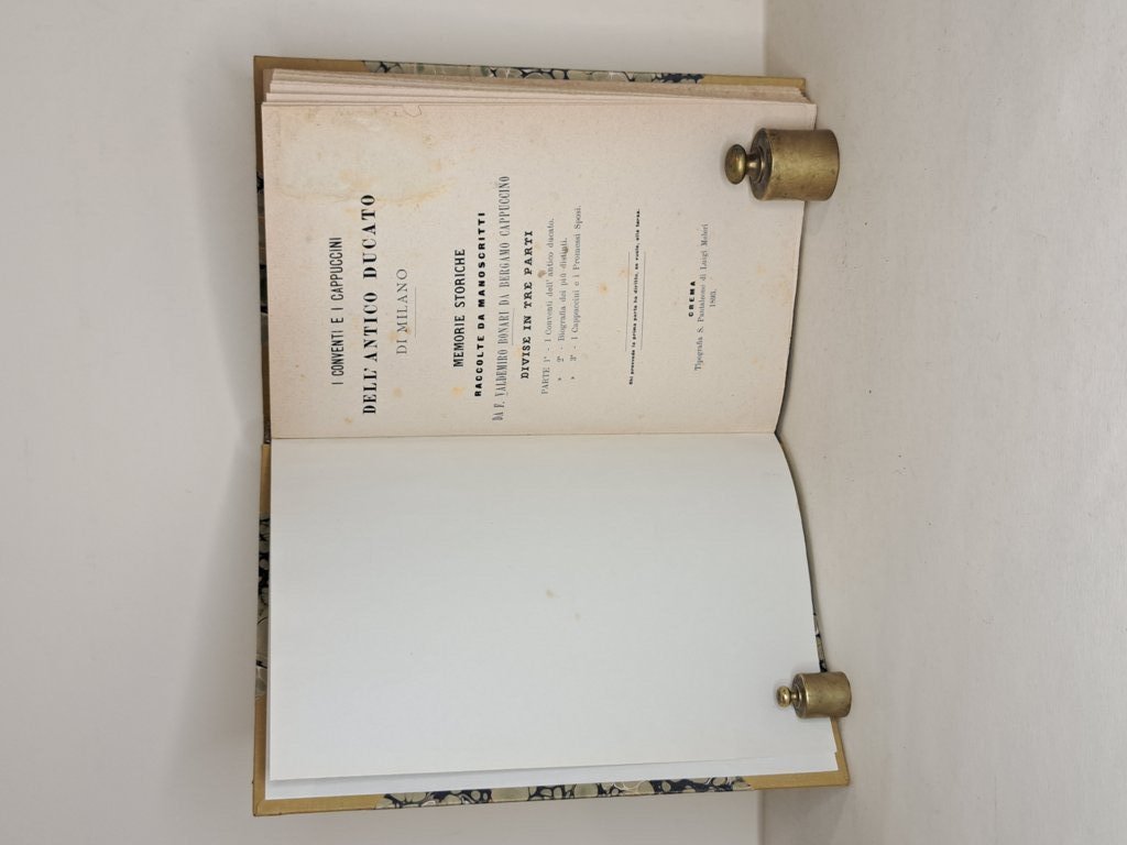 8°, cm 23, 3 volumi di pp. 439; 386, V; 675, LXXV, (5); rilegati in mezza tela con punte e piatti in carta marmorizzata, titoli in oro su tassello. Opera concepita in tre parti, di cui l'ultima non fu mai pubblicata (doveva trattare dei cappuccini nei Promessi Sposi). La prima parte, in un volume, è sui conventi e la seconda parte, in due tomi sulle biografie, al fondo un'appendice di Felice Casati, con suo ritratto fotografico su una tavola fuori testo e un'altra tavola con ritratto di Valdemiro Bonari di Bergamo accompagnata dalla sua biografia. Raro.