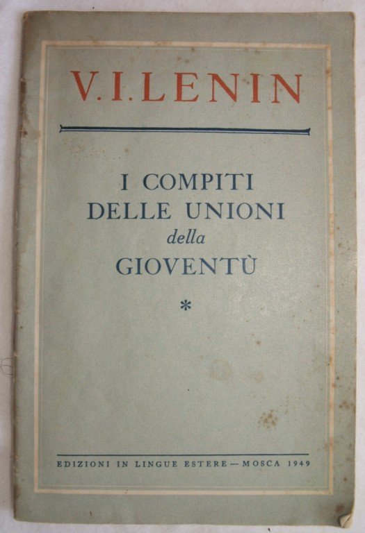 In 8. Dim. 20x13 cm. Pp. 26. Discorso pronunciato al III Congresso dell'Unione della gioventu comunista della Russia 2 Ottobre 1920. Note manoscritte. Brossura editoriale originale in discrete condizioni generali con fioriture. Legatura in buone condizioni. All'interno le pagine si presentano in discrete condizioni con rare fioriture, ma una gora d'umidità al margine di piegatura di tutto il volume. Manuscripted notes. Editorial original cover in fair general conditions with foxings. Binding in good conditions. Inside pages are in fair conditions with occasional foxings, but an humidity stain in the inner edge of all volume.