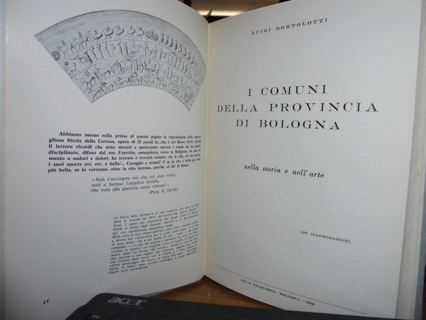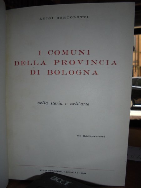 Bortolotti, Luigi. Bologna, Tip. San Francesco, 1964. I Comuni della Provincia di Bologna nella Storia e nell' Arte. In-8°, tela con titolo in oro entro tassello al dorso, brossure originali conservate. xvi, 509 pp. con 150 illustrazioni nel testo. Come nuovo. Neg. Bol. mob. 14