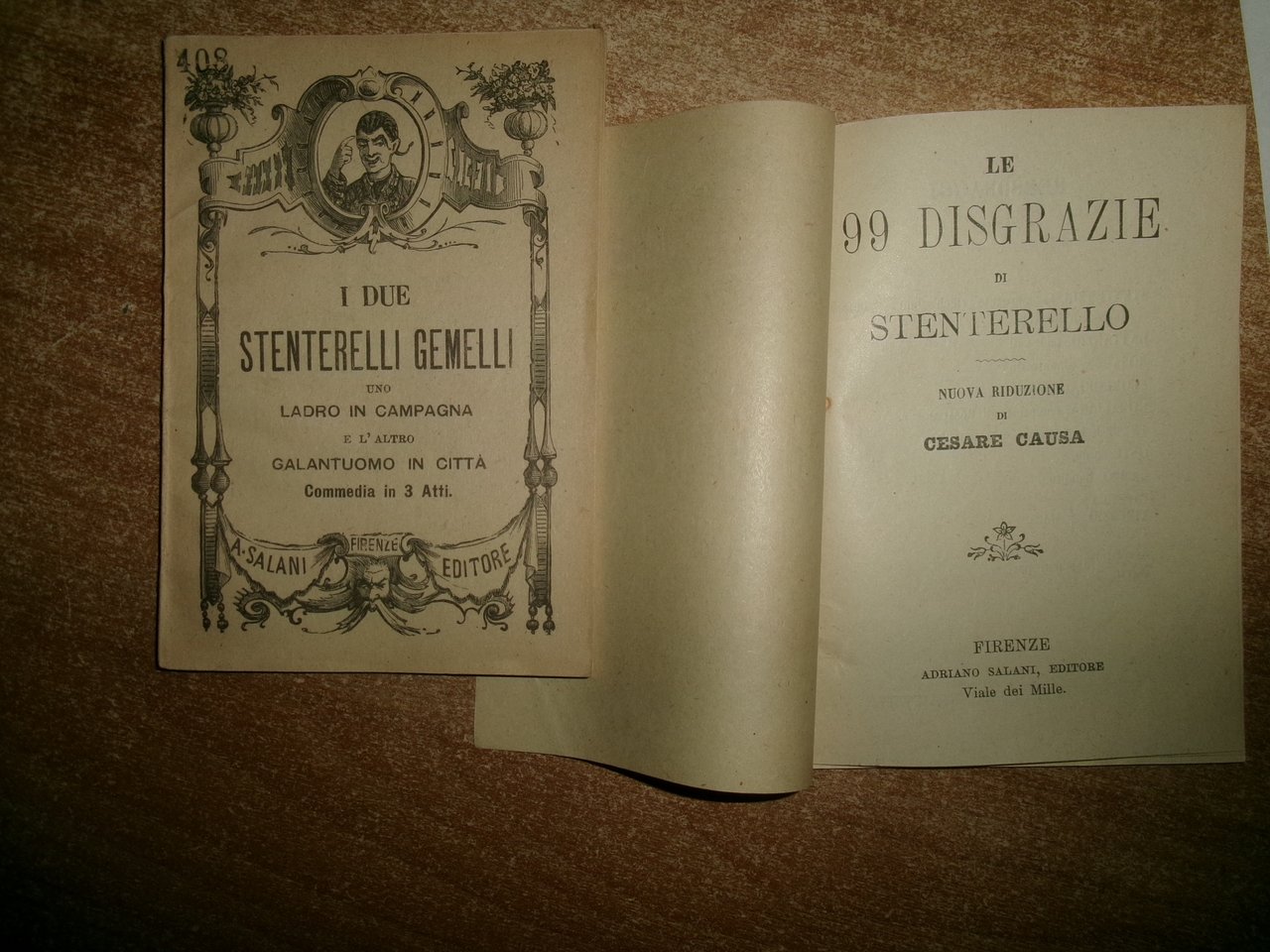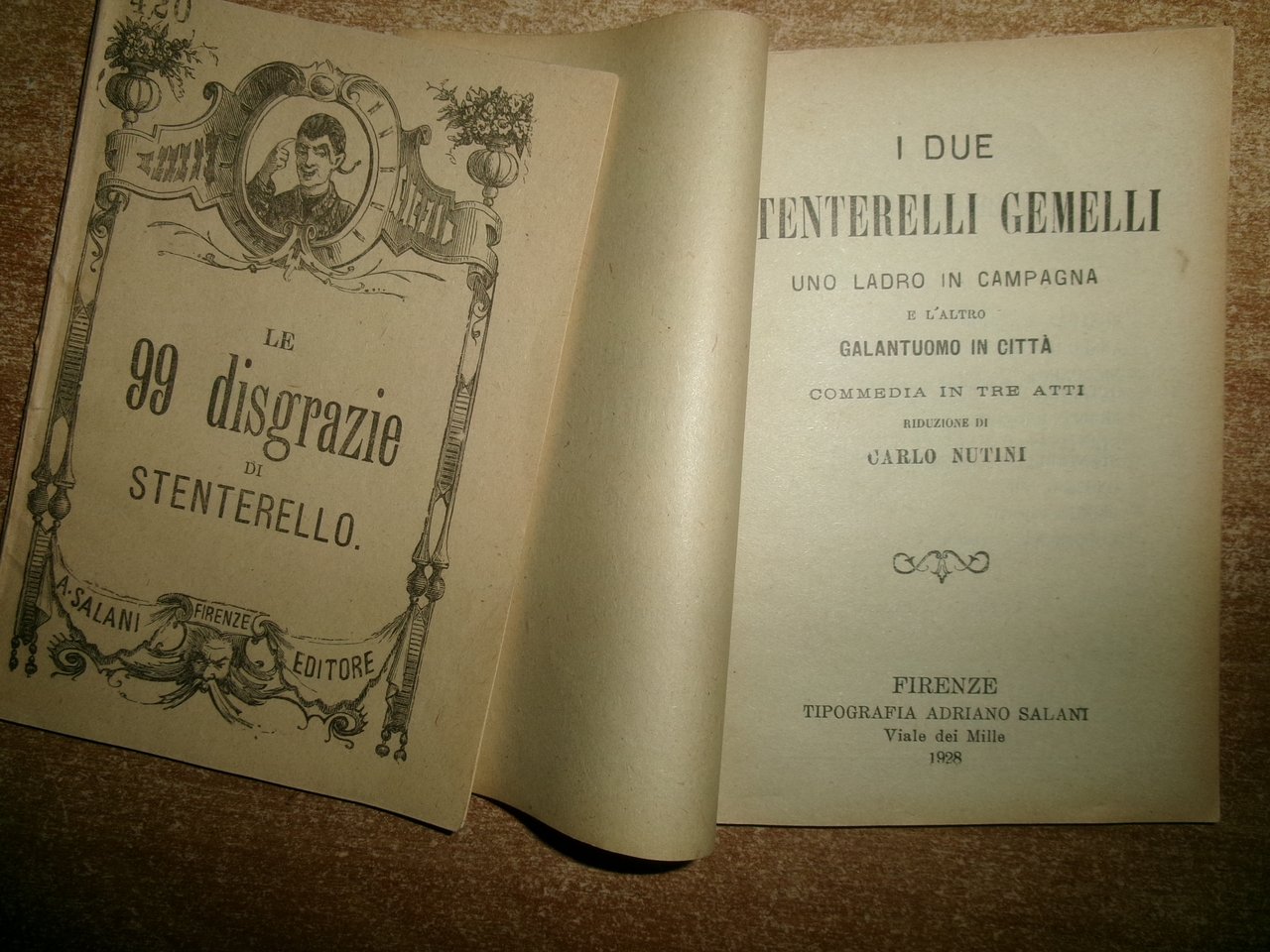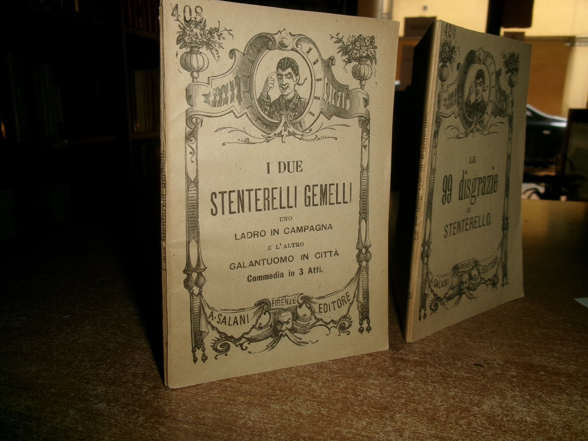 I Due Stenterelli Gemelli. Uno ladro di campagna e l' altro galantuomo in città. Commedia in tre atti. Riduzione di Carlo Nutini. Le 99 disgrazie di Stenterello. Nuova riduzione di Cesare Causa. 2 opuscoli in-16° piccolo, br. orig. 62, (2) pp.; 56 pp. Ben conservati. Neg. mob. E entro busta trasp.