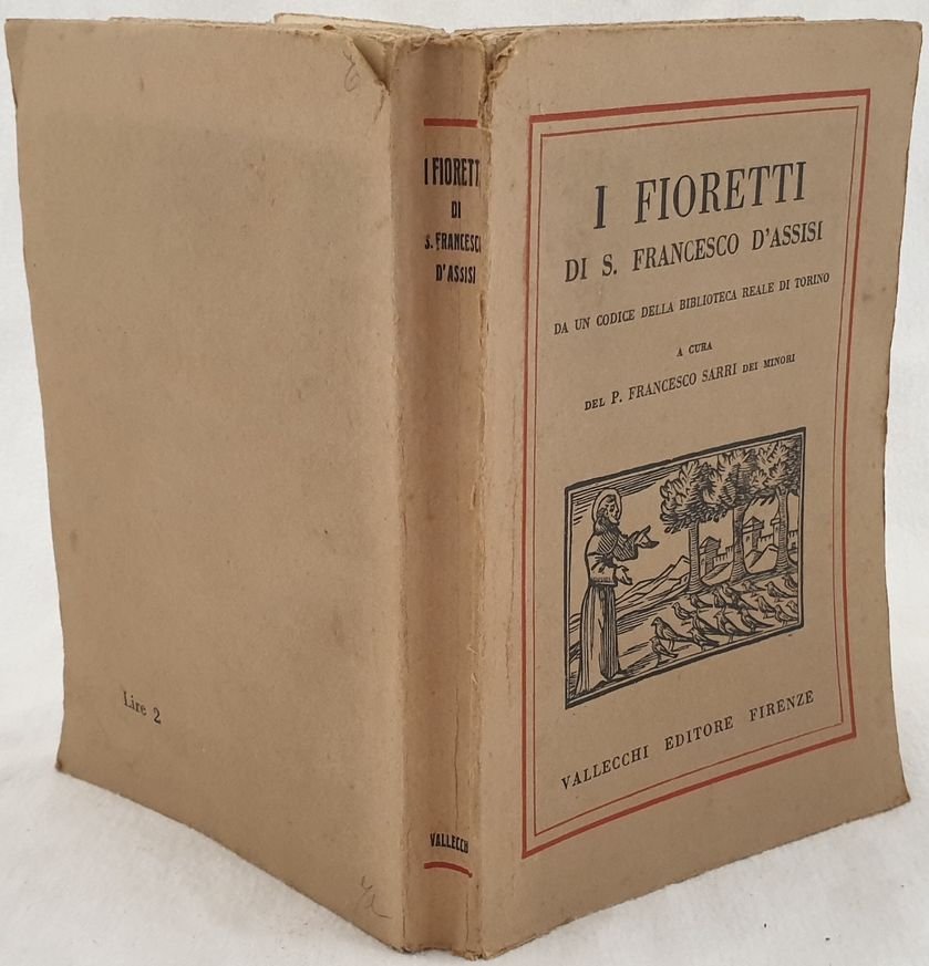 Edizione del 1935 de I fioretti di San Francesco d'Assisi, versione di Padre Francesco Sarri All'interno sono presenti numerose illustrazioni copia di xilografie riprodotte da un edizione dei Fioretti del secolo XVII. Dedica alla prima pagina di sguardia. In buone condizioni. Copertina editoriale in buone condizioni generali con lievi usure ai margini e dorso. Legatura in buone condizioni. All'interno le pagine si presentano in buone condizioni con rare fioriture. In 8. 20x14 cm. Pp. 224. Edition of 1935 of I fioretti by Saint Francis from Assisi, version by Father Francesco Sarri. Insdie there are different illustrations copy of some woodcuts reproduced by an edition of Fioretti of the XVII century. Dedication in the first endpage. In good conditions. Editorial cover in good general conditions lightly worn in the extremities. Binding in good conditions. Inside pages are in good conditions with occasional foxing. In 8. 20x14 cm. Pp. 224.