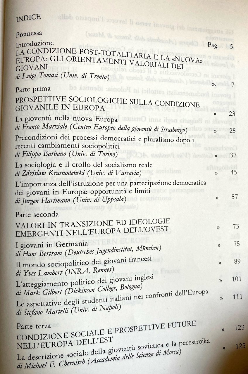 Soggetti: Storia europea contemporanea Scienze sociali Sociologia Urbana Analisi Politica 1989 Generazione Z Alpha Giovani Ovest Est Condizione giovanile Europeizzazione Ricerca Sociale Filosofia Processi Contestazione Religione Sviluppo Sottosviluppo Teoria sociologica Comunismo Unione sovietica Crollo Muro di Berlino Germania Polonia Paesi Ricchezza Povertà Miseria Capitalismo Globalizzazione Dopoguerra Economia Condizioni economiche Emigrazione Totalitarismo Dittatura Gioventù Democrazia Pluralismo Cambiamenti sociopolitici Socialismo reale Istruzione Partecipazione Opportunità Transizione Ideologie Russia Francia Regno Unito Italia Perestrojka Lavoro Vita Cecoslovacchia Fondamentalismo cattolico Identità Bulgaria Anni Ottanta Novanta Lotta Innovazione Bibliografia Riferimento Studi culturali Consultazione Libri rari fuori catalogo Guerra Fredda Valori universali Salute Ambiente Scambio Erasmus UE Libertà Uguaglianza Stato Diritto Prospettive Diritti umani Sostenibilità Cambiamento climatico Viaggio Tecnologia Esperienze internazionali Digitalizzazione Nativi digitali Culture Integrazione Problemi Differenze storiche Mobilità Urss RDT Beatles Breznev Sciopero Rock Comportamenti Varsavia Costituzione Agitazioni Dubcek Fabbriche Fejto Beat Governo Jugoslavia Kruscev Maggio francese Manifestazioni Movimenti giovanili Movimento studentesco Primavera di Praga Repressione Censura Rolling Stones Sessantotto Mosca Sistema socialista Stalin Democrazie Studenti Tolleranza Addams Assimilazione Collettiva Comunanza Comunità Conflitti Discriminazioni Donne Edward Shils Emile Durkheim Gruppi etnici Minoranze etniche Tutela Famiglia Immigrati Max Weber Mead Modood Normative Park Popolazione Razziale Relazioni Scuole Adulti Chiesa Età Comportamento Confronti Cultura Formazione Gran Bretagna Identificazione Inglehart Mass media Michelat Modernizzazione Mongardini Postmaterialismo Protesta Protestanti Realizzazione Religiosità Renzo Gubert Socializzazione Società Solidarietà Tendenza Unesco Volontariato Welfare-state Seminari Convegni Elezioni Romania Gorbaciov Rivoluzione Centesimus Annus Giovanni Paolo II Woytila Religioni Luhmann Geffroy Domenach Furham Gunter CEE CECA Vaclav Havel Ceausescu Tito Lech Walesa Cina Mercato Esportazioni Stati Uniti Industria Mannheim Blouson Noir Marchi TV Teddy Boy Edgar Morin Moda Abbigliamento Anticonformismo Dubet Chamboredon Hippies Punks Sottocultura Underground Myrdal Hartmann Sciolla Ricolfi Baumann Cipolla Socialità Easter Secolarismo Secolarizzazione Opus Dei Intollernza Gilles Kepel Hadiths Lebfèvre Malta Rushdie Satanic Verses Schmidtchen Sekten Psychokultur Skinheads Teenagers Scheler Tönnies Contemporary European History Social Sciences Urban Sociology Political Analysis Generation Youth West East Condition Europeanization Social Research Philosophy Processes Contestation Religion Development Underdevelopment Sociological Theory Communism Soviet Union Fall Berlin Wall Germany Poland Countries Wealth Poverty Capitalism Globalization Postwar Economy Economic Conditions Emigration Totalitarianism Dictatorship Democracy Pluralism Sociopolitical Changes Socialism Education Participation Transition Ideologies France United Kingdom Italy Work Life Czechoslovakia Catholic Fundamentalism Identity Eighties Nineties Struggle Innovation Bibliography Reference Cultural Studies Rare Books Out of Print Cold War Values Health Environment Freedom Equality State Law Perspectives Human Rights Sustainability Climate Change Travelling Technology International Experiences Digitalization Natives Cultures Integration Historical Differences Mobility Strike Behaviors Warsaw Constitution Government Yugoslavia French May Demonstrations Movements Prague Spring Repression Censorship Sixty-eight Moscow System Democracies Students Tolerance Assimilation Community Conflicts Discrimination Women Ethnic groups Minorities Protection Family Immigrants Racial population Relations Schools Adults Church Age Behavior Comparisons Great Britain Modernization Postmaterialism Protestants Religiosity Socialization Society Solidarity Trend Volunteering Seminars Conferences Elections Revolution John Paul Religions China Market Exports States Industry Brands Fashion Clothing Nonconformism Subculture Sociality Secularism Secularization Intolerance