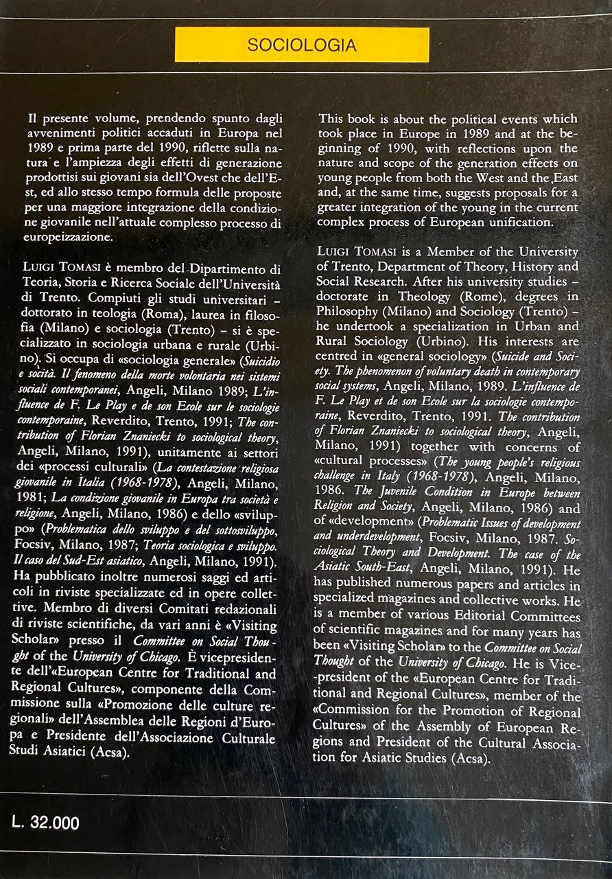 - Storia europea, Storia contemporanea, Scienze sociali, Sociologia, Sociologia Urbana, Analisi, Politica, Generazioni, Giovani, Ovest, Est, Condizione giovanile, Europeizzazione, Contestazione, Religione, Sviluppo, Sottosviluppo, Teoria sociologica, Comunismo, Unione sovietica, Germania, Polonia, Paesi, Ricchezza, Povertà, Miseria, Capitalismo, Globalizzazione, Dopoguerra, Economia, Condizioni economiche, Emigrazione, Totalitarismo, Gioventù, Democrazia, Pluralismo, Cambiamenti sociali, Socialismo, Istruzione, Partecipazione, Transizione, Ideologie, Francia, Regno Unito, Italia, Lavoro, Cecoslovacchia, Fondamentalismo, Identità, Anni Ottanta, Anni Novanta, Innovazione, Studi culturali, Libri fuori catalogo, Guerra Fredda, Valori universali, Ambiente, Scambio, Libertà, Uguaglianza, Diritti umani, Sostenibilità, Cambiamento climatico, Viaggio, Digitalizzazione, Nativi digitali, Culture, Integrazione, Mobilità, Movimenti giovanili, Democrazie, Discriminazioni, Gruppi etnici, Minoranze etniche, Relazioni, Comportamento, Confronti, Formazione, Gran Bretagna, Postmaterialismo, Religiosità, Socializzazione, Società, Solidarietà, Seminari, Convegni, Rappresentanza, Religioni, Moda, Sottocultura, Socialità, Secolarismo, Secolarizzazione, Intolleranza