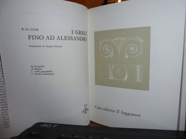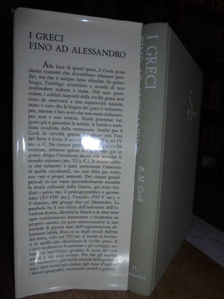 R.M. Cook. Milano, Il Saggiatore, 1963. I Greci fino ad Alessandro. In-8° piccolo, tela edit. con sovracopertina. 288 pp. con 89 fotografie, 36 disegni, 3 carte geografiche, 1 tavola cronologica. In ottimo stato di conservazione. Uff. TV. mob. nostro