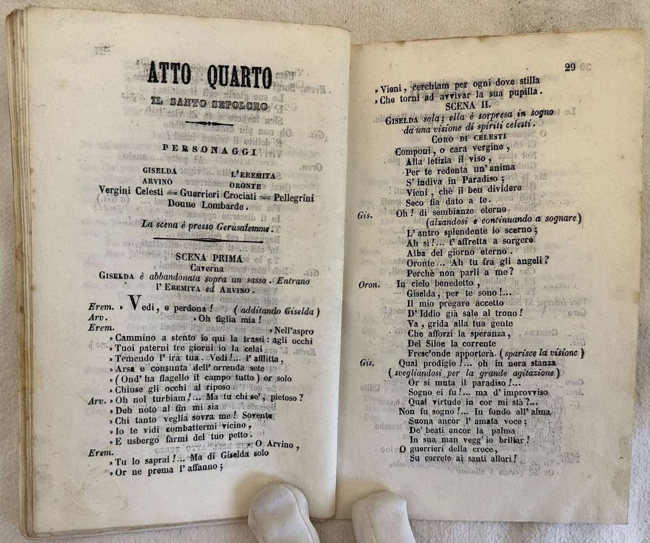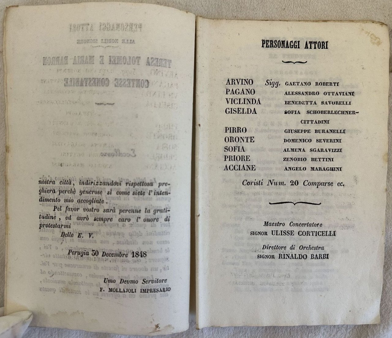 Libretto della libretto d'opera "I lombardi alla prima crociata" musicata da Giuseppe Verdi (1813-1901) da rappresentarsi a Perugia nella Nobile Accademia del casino di Perugia durante il Carnevale 1848-49. Libretto di Temistocle Solera. L'opera venne rappresentata per la prima volta l'11 febbraio 1843 al Teatro alla Scala di Milano. Senza data ma probabilmente pubblicato nel 1849 anno della rappresentazione a cui fa riferimento sul frontespizio. Lista degli attori (Gaetano Roberti, Alessandro Ottaviani, Benedetta Savorelli, Sofia Schoberlechner, Giuseppe Buranelli, Domenico Severini, Almena Sgaravizzi, Zenobio Bettini, Angelo Maraghini). Maestro concertatore Ulisse Corticelli; Direttore di orchestra Rinaldo Barbi. In buone condizioni. Copertina assente. Legatura in discrete condizioni con qualche rottura e pagina staccata. All'interno le pagine si presentano in buone condizioni con rare fioriture. In 8. cm 19x12. Pp. 32.Booklet of the famous opera "I Lombardi alla prima crociata" by the italian composer Giuseppe Verdi (1813-1901) to be represented in Perugia in Nobile Accademia del casino di Perugia during Carnival 1848-49. Booklet by Temistocle Solera. The work was represented for the first time the 11st of february 1843 in Teatro alla Scala of Milan. Not dated but probably published in 1849 year of the representation refeered in the title page. List of actors (Gaetano Roberti, Alessandro Ottaviani, Benedetta Savorelli, Sofia Schoberlechner, Giuseppe Buranelli, Domenico Severini, Almena Sgaravizzi, Zenobio Bettini, Angelo Maraghini). Maestro concertatore Ulisse Corticelli; Direttore di orchestra Rinaldo Barbi. In good conditions. Cover lacks. Binding in fair conditions with some cracks and page detached. Inside pages are in good conditions with occasional foxing. In 8. cm 19x12. Pp. 32.