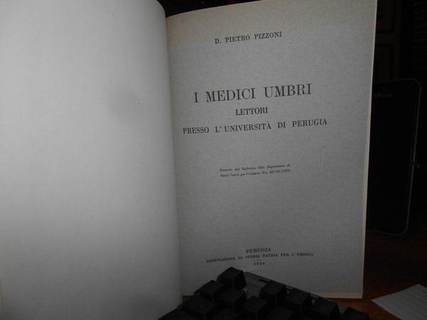 PIETRO PIZZONI. Perugia, Deputazione di Storia Patria per l' Umbria, 1950. I MEDICI UMBRI lettori presso l' Università di Perugia. Estratto dal Bollettino di Deputazione di Storia Patria per l' Umbria. In-8°, tela edit. con titolo in oro entro tassello al dorso, brossure originali conservate. 208 pp. Ottimo esemplare in legatura anni '70 con le copertine originali conservate. Uff. C - IV - 6 - 2
