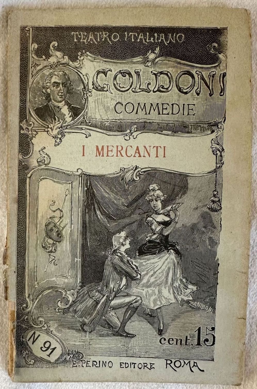Edizione Perino del 1893 della commedia "I mercanti" di Carlo Goldoni della collana "Teatro italiano". Sono presenti due incisioni a piena pagina, una delle quali in antiporta. In buone condizioni. Copertina editoriale in discrete condizioni con lievi usure marginali. Legatura in buone condizioni. Pagine in buone condizioni generali con fioriture. In 16. Dim. 17,5x11 cm. Pp. 63.Perino edition of 1893 della commedia "I mercanti" by Carlo Goldoni of the series "Teatro italiano". Inside there are two engravings, one of them in the frontspice. In good conditions. Editorial cover in fair conditions lightly worn in the extremities. Binding in good conditions. Pages are in good conditions with foxing. In 16. Dim. 17,5x11 cm. Pp. 63.