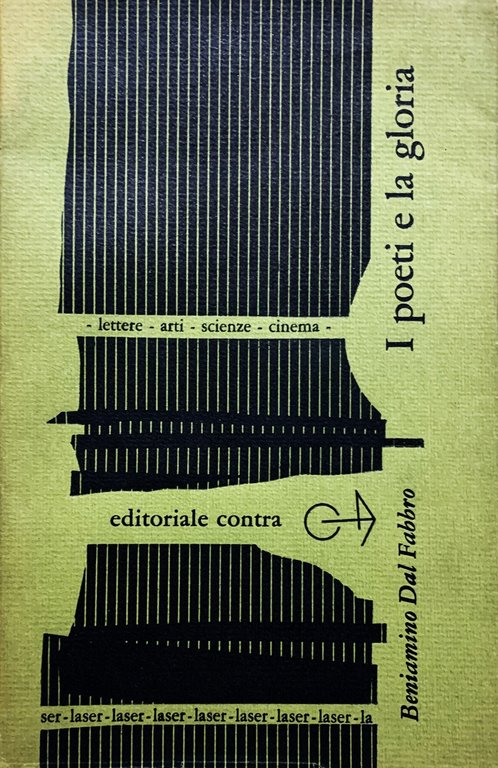I ed. della raccolta: dicembre 1965. Collana Laser (lettere - arti - scienze - cinema). XVI grande/ 162/ bross./ sovraccoperta in carta verde oliva con grafica in nero. Stato buono (usura della sovraccoperta ai margini - pagine brunite). Indice: Premessa; B. D. F. (Milano, novembre 1965) - I poeti disarmati - I maestri altezzosi - I poeti e la gloria - Decadenza dei Vittoriali - Critica contro poesia - Eclissi del dicitore - Tra le ceneri del futurismo - Papini incoronato di latta - La cúccuma del caffè di Saba - La rinuncia di Rebora - Con Jahier tra gli Alpini - Solitudine di Pasternak - Cronachette leopardiane - Della poesia: 43 paragrafi.