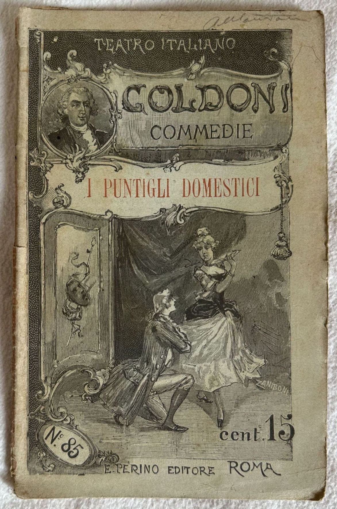 Edizione Perino del 1893 della commedia "I puntigli domestici" di Carlo Goldoni della collana "Teatro italiano". Sono presenti due incisioni a piena pagina, una delle quali in antiporta. In buone condizioni. Copertina editoriale in discrete condizioni con lievi usure marginali. Legatura in discrete condizioni con lievi rotture. Pagine in buone condizioni generali con fioriture. In 16. Dim. 17,5x11 cm. Pp. 64.Perino edition of 1893 off the play "I puntigli domestici" by Carlo Goldoni of the series "Teatro italiano". Inside there are two engravings, one of them in the frontspice. In good conditions. Editorial cover in fair conditions lightly worn in the extremities. Binding in fair conditions with light cracks. Pages are in good conditions with foxing. In 16. Dim. 17,5x11 cm. Pp. 64.