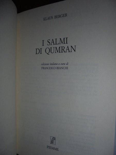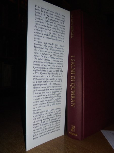 Berger, Klaus. Casale Monferrato, 1995. I Salmi di Qumran. L' inedito salterio della Comunità Monastica del Mar Morto. Edizione italiana a cura di Francesco Bianchi. In-8°, tela edit. con titolo in oro al dorso, sovracopertina ill. a col. 309 pp. con 8 tavole a colori f.t. Come nuovo. Uff. TV. mob. nostro.