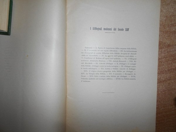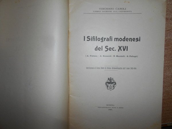 VINCENZO CASOLI. Modena, Tipo-Litografia Bassi e Debri, 1905. I Sifilografi modenesi del Sec. XVI. In-8°, br. con due punti metallici. 37 pp. Raro opuscolo ben conservato. Uff. A - II - 3 - 2