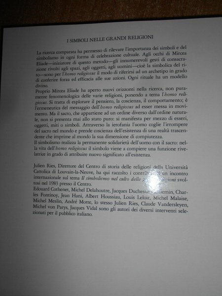 AA. VV. A cura di JULIEN RIES. Milano, Jaca Book, 1988. I Simboli nelle Grandi Religioni. In-8°, cart. edit. 271 pp. Come nuovo. Uff. stanzetta mob. piccolo a destra