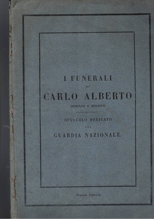 I solenni funerali celebrati in Torino ad onoranza del magnanimo Re Carlo Alberto, per decreto del subalpino parlamento con tavole litografiche, rappresentatnti le primarie opere d'arte in tal solenne occasione. Opuscolo dedicato a conservare le famiglie la rimembranza…Unito un coro funebre di Guidi e musica di Speranza.