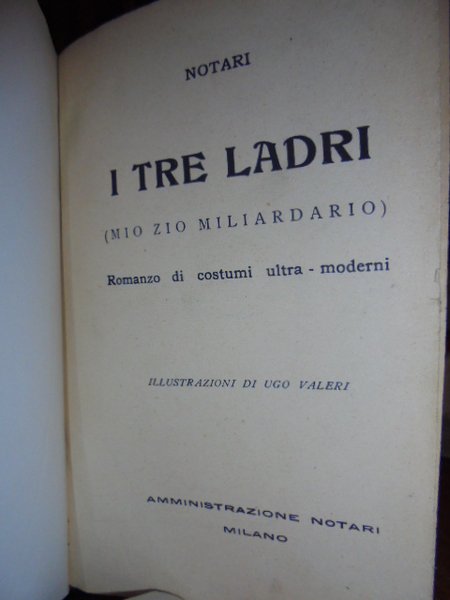 Umberto Notari (Bologna, 1878 – Perledo, 1950). Milano, Tip. Virgilio, (primi '900). I Tre Ladri (mio zio miliardario). Romanzo di costumi ultra - moderni. In-16°, m. tela con tassello al dorso. 255 pp. con numerose illustrazioni di Ugo Valeri n.t. Ben conservato. Neg. mob. 3