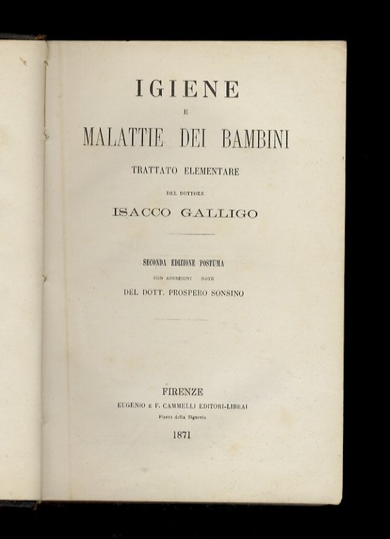 Igiene e malattie dei bambini. Trattato elementare del dottore Isacco Galligo. Seconda edizione postuma, con addizioni e note del dott. Prospero Sonsino.