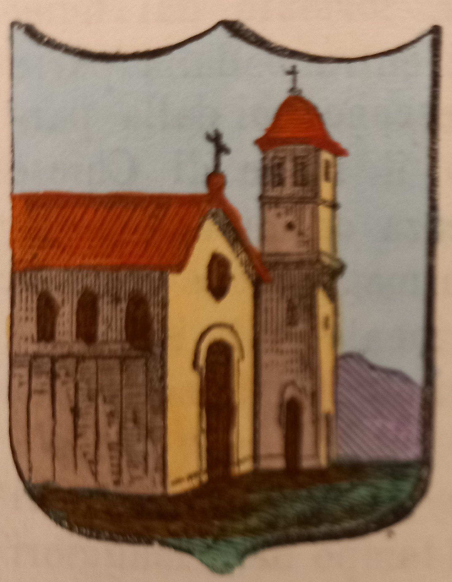 Piccolo stemma comunale colorato a mano d’epoca (cm. 3,8 x 3,2 ca.). Stralcio dal Dizionario Corografico illustrato dell’Italia, edito a Milano nel 1868. Ogni stemma di questa raccolta è inserito in una o più pagine di testo con la descrizione della località, notizie storico - geografiche e statistiche (numero degli abitanti e degli elettori, guarnigioni della Guardia Nazionale, ecc.). Spesso il testo è redatto da studiosi locali o dai sindaci, con maggiori, interessanti notizie.