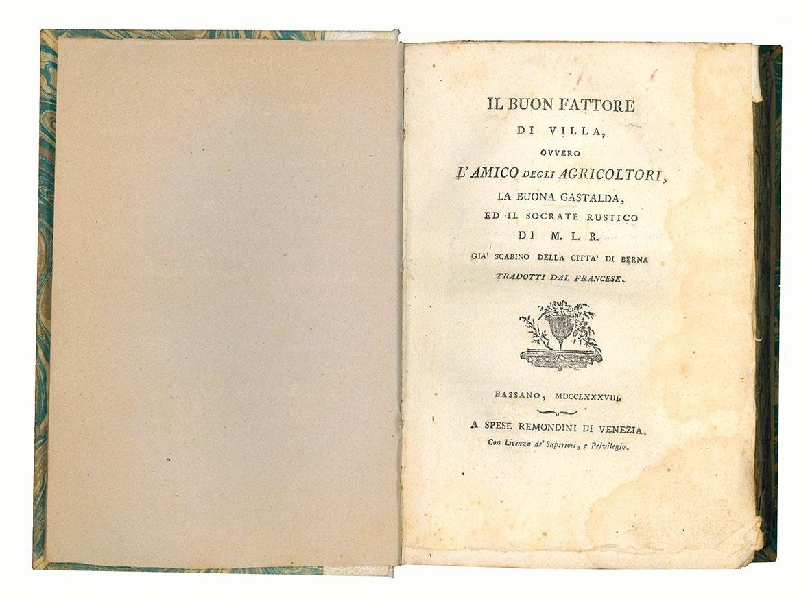Prima edizione della traduzione italiana dell'opera "Le bon fermier", una serie di dialoghi sull'agricoltura, pubblicati per la prima volta in francese a Parigi nel 1767.