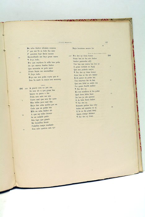 In-folio. Couverture d'origine conservée. 1feuillet. 187 pages. 1 planche héliotypée sur papier fort. (30x24 Cm). Demi toile à coins, cartonnages imprimés à motifs héraldiques, dos lisse. Publié en 1880 à Halle, ville universitaire importante dès le XVII siècle, l'ouvrage d'Enrico Molteni, "Il Canzoniere Portoghese Colocci-Brancuti pubblicato nelle parti che completano il Codice Vaticano 4803", se présente comme une pièce essentielle pour les études de la littérature portugaise médiévale et de la philologie. Exemplaire bien conservé.