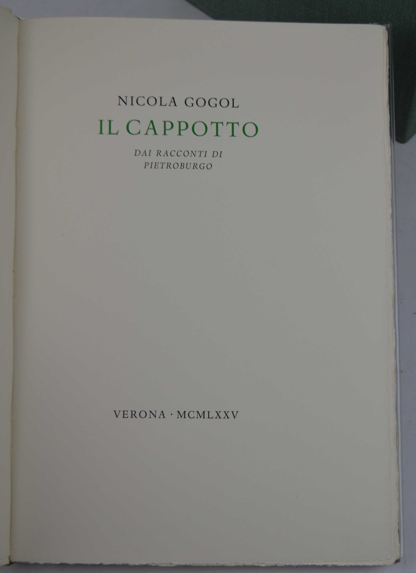Cm. 29,5, pp. 122. Con 6 belle tavole fuori testo all'acquaforte di Pietro Annigoni. Legatura edit. in mezza pergamena con fregio al piatto e titoli al dorso. Taglio di testa dorato. Protetto da acetato ed entro custodia edit. Perfetta conservazione, in stato di nuovo. E' presente il doppio foglio volante che presenta l'opera. Tiratura limitata a 160 esemplari stampati su carta distinta, numerati e firmati da Pietro Annigoni. Particolarmente interessante e ben riuscita la suite di immagini dedicata al capolavoro russo e che ricorda, nella sua forza ed intensità, l'arte delle incisioni di Goya. Testo originale in russo e traduzione italiana nella traduzione di Nerina Martini Bernardi Carrescia.