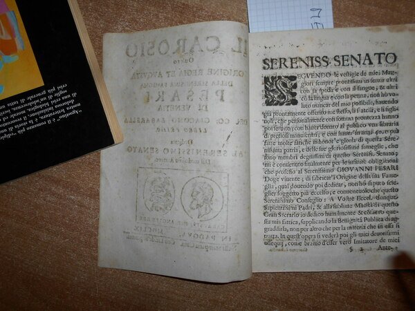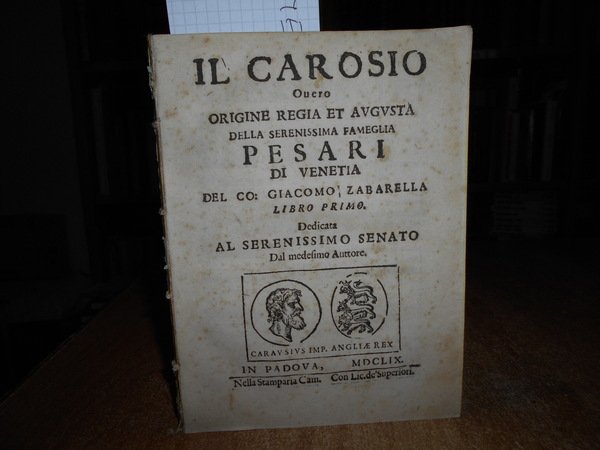 ZABARELLA, GIACOMO (SEC. XVII). In Padova, STAMPERIA CAMERALE, 1659. IL CAROSIO OVVERO ORIGINE REGIA ET AUGUSTA DELLA SERENISSIMA FAMIGLIA PESARI DI VENETIA. IN 4° , BR., COP. MUTA. (24), 72 PP. CON MEDAGLIONE INCISO IN LEGNO NEL FRONTESPIZIO. LIBRO PRIMO SOLO PUBLICATO. RARISSIMO. GHENO, BIBLIOGRAFIA GENEALOGICA ITALIANA, P. 220. SPRETI & DEGLI AZZI, BIBLIOGRAFIA ARALDICA ITALIANA, 4147. VEDOVA, SCRITTORI PADOVANI, PP. 432-33. Ben conservato. Neg. scat. rossa opusc. nonn. entro busta trasp. parav.