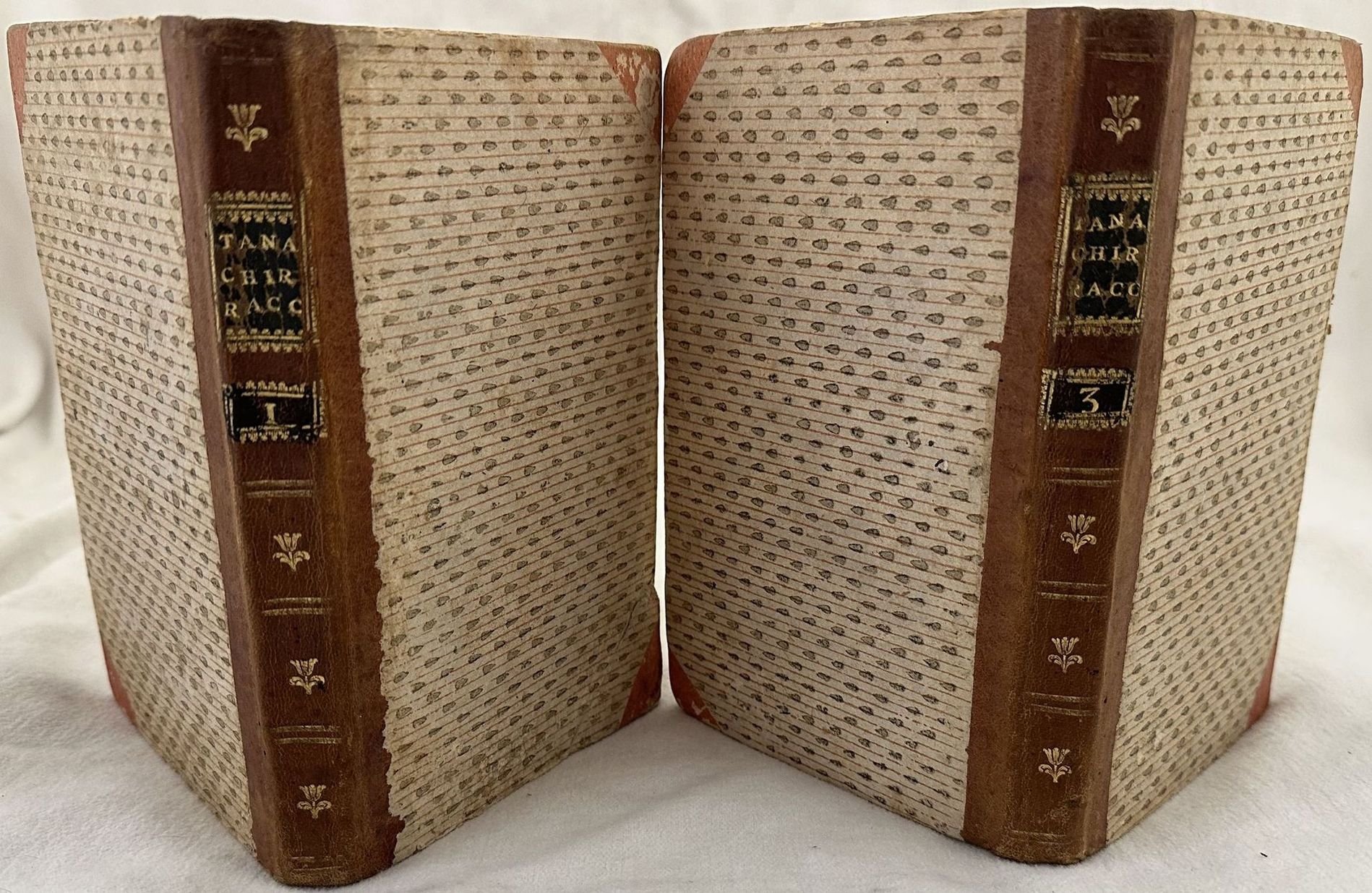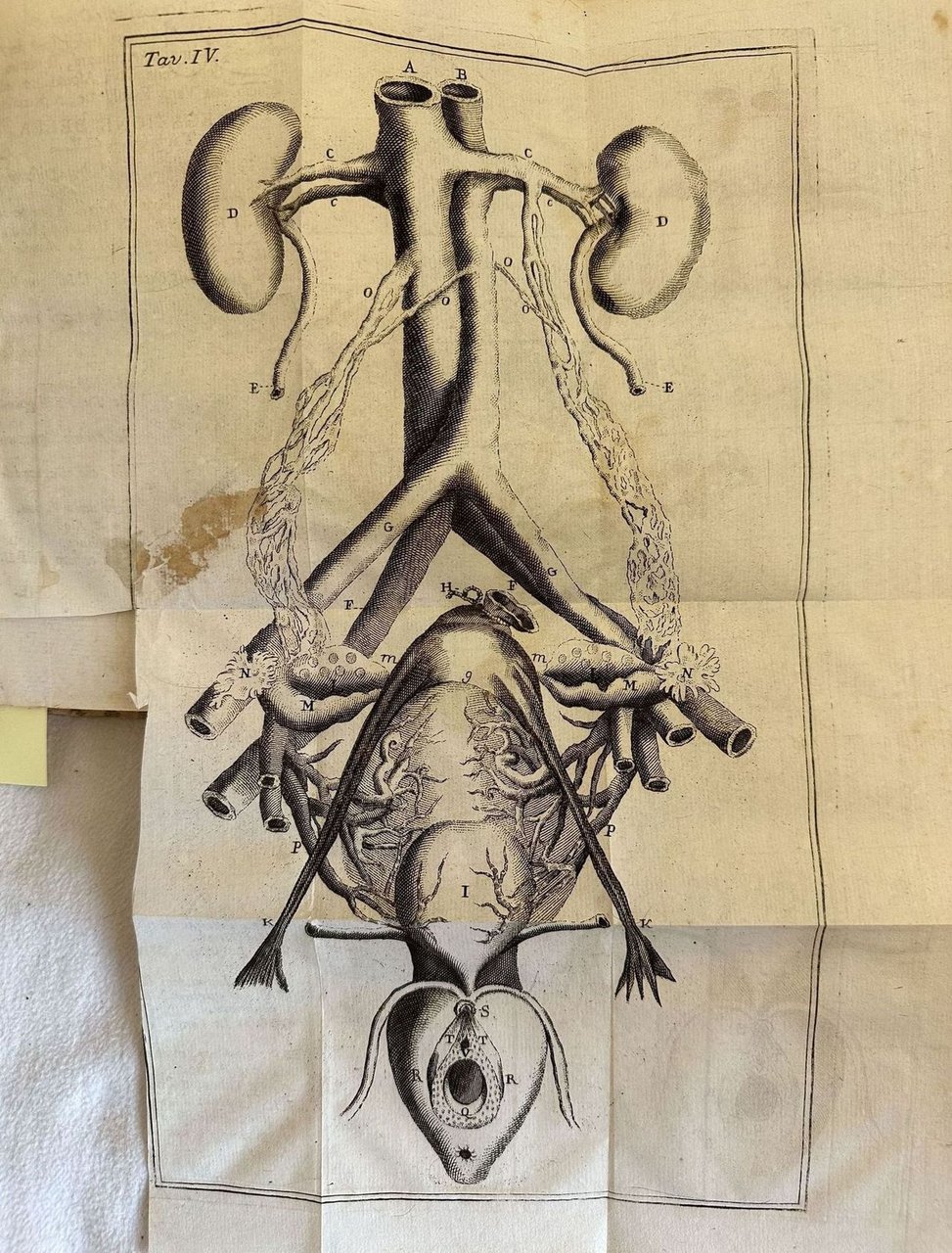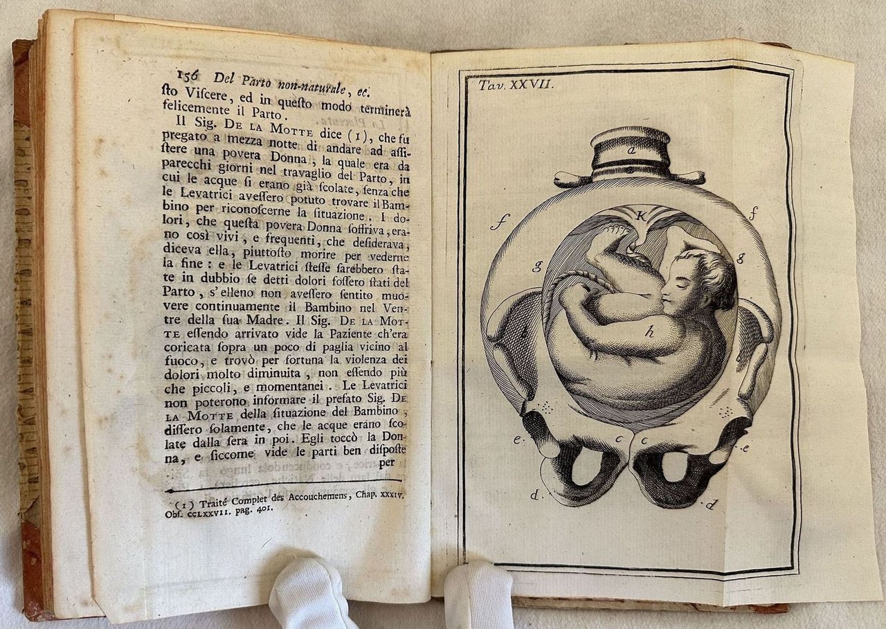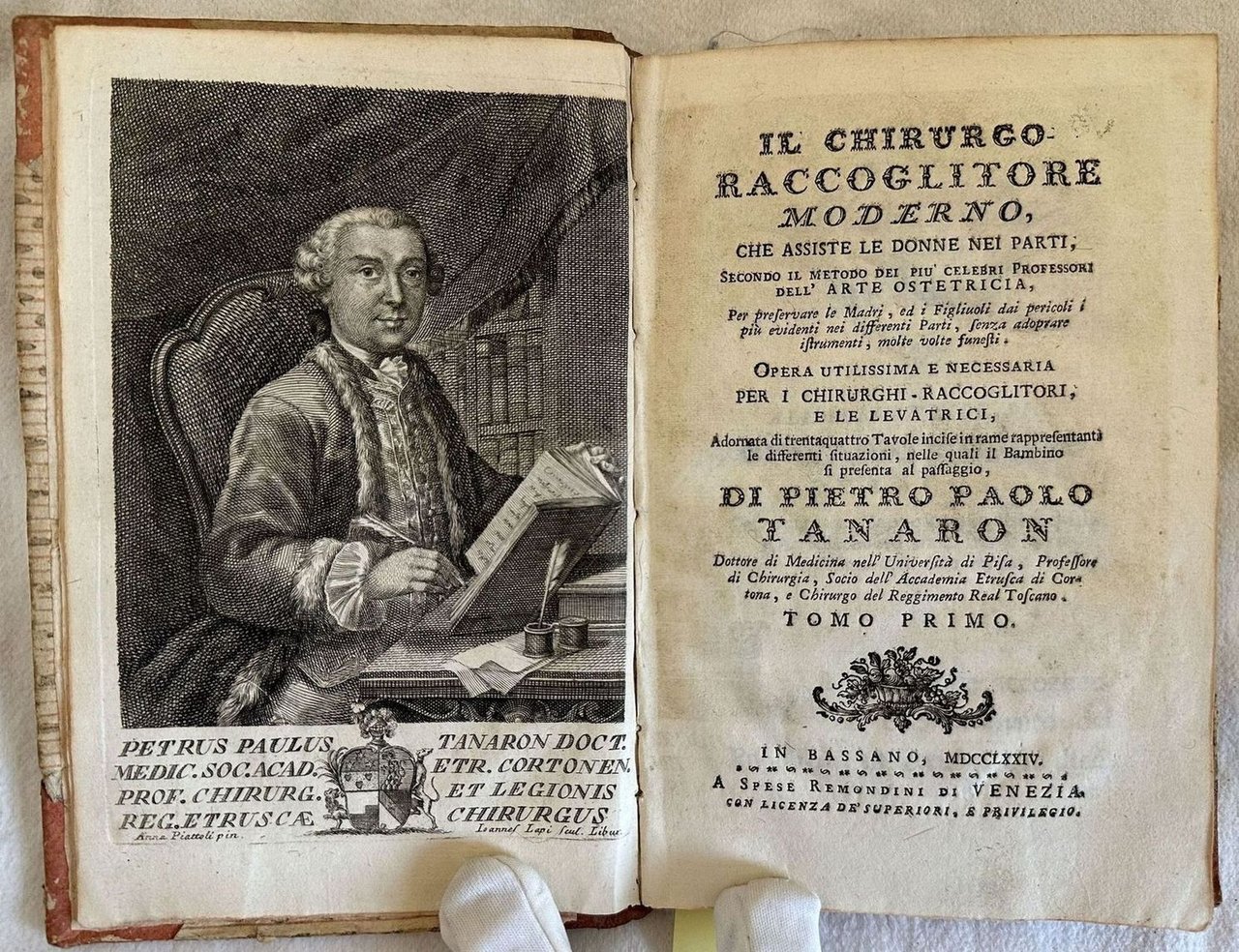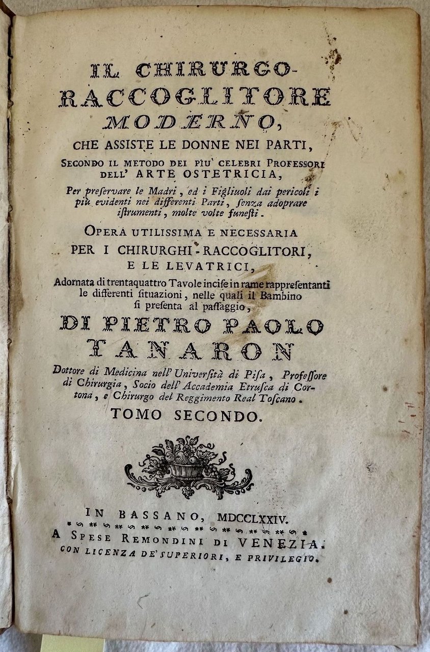 Edizione Remondini del 1774 di questo trattato di ostetricia del chrirugo italiano Pietro Paolo Tanaron. Tanaron fu chirurgo del Reggimento Reale della Toscana, professore di chirurgia a Firenze e membro dell'Accademia etrusca di Cortona. L'opera era composta da tre tomi siamo in possesso dei primi due. Manca il terzo tomo sulle malattie dei bambini. All'interno: parti contro natura, Mostri, Cesareo, cure al bambino dopo la nascita, Requisiti della balia, Malattie e disturbi post partum. Alcune esperienze dell'autore stesso (osservazione sopra una cesarea fatta più di un quarto d'ora dopo spirata la donna con felice successo per la prole). Il testo è impreziosito da 32 tavole fuori testo più volte ripiegate tra le quali il ritratto dell'autore in antiporta, strumenti e scene mediche. In buone condizioni. Copertina in mezza pelle coeva con titolo e decorazioni in oro al dorso in buone condizioni generali con lievi usure ai margini e dorso. Legatura in buone condizioni. All'interno le pagine si presentano in buone condizioni con fioriture. Restauro orizzontale alla tavola n. II, XVII. Il tassello al tomo secondo indica erroneamente "3". In 8. cm 19x12,5. Pp. XXXII+158+IX tav., 182+X-XXXII tav., Remondini edition of 1774 of this treaty of obstetrics by the italian surgeon Pietro Paolo Tanaron. Tanaron was surgeon of the Reggimento Reale della Toscana, techer of surgery in Florence and member of Accademia etrusca in Cortona. The work was made up of three tomes we onyl have the first two tomes. The third tome about deseases of children lacks. Some observations of the author. The text is enriched by 32 out of text plates with the portrait of the author, instruments and scenes of medicine. In good conditions. Half leather coeval cover with gilted title in the spine in good conditions lightly worn in the extremities. Binding in good conditions. Pages in good conditions with foxing.Horizontal restauration in plate n. II, XVII. Title label in tome 2 falsely indicates "3". In 8. cm 19x12,5. Pp. XXXII+158+IX tav., 182+X-XXXII tav.,