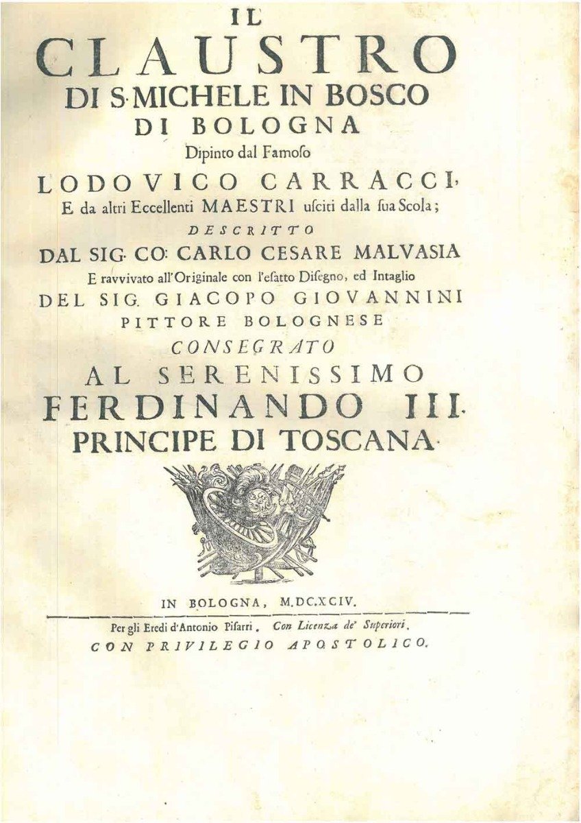 Il claustro di S. Michele in Bosco di Bologna dipinto dal famoso Lodovico Carracci, e da altri eccellenti maestri usciti dalla sua scola descritto dal sig. co: Carlo Cesare Malvasia e ravvivato all'originale con l'esatto disegno, ed intaglio del sig. Giac