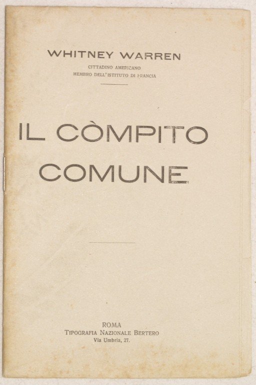 In 16. Dim. 18,5x12,5 cm. Pp. 32. Interessante opuscolo di propaganda della prima guerra mondiale scritto da Whitney Warren. L'autore predica l'unione tra Italia ed America e descrive la situazione della guerra. In buone condizioni. Brossura editoriale in buone condizioni generali con lievi usure ai margini e dorso. Legatura in ottime condizioni. All'interno le pagine si presentano in ottime condizioni con rare fioriture, ancora unite. Interesting pamphlet of propaganda of the first world war written by Whitney Warren. The author preeches the union between Italy and America and describes the situation of war. In good conditions. Editorial cover in good general conditions slightly worn in the edges and spine. Binding in very good conditions. Inside pages are in very good conditions with occasional foxings, still bound.