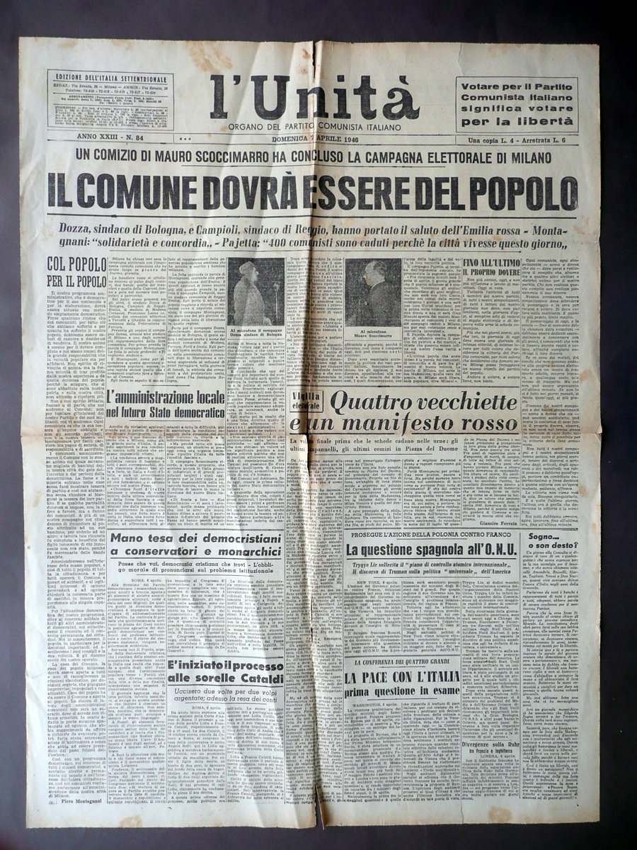 Quotidiano, Un comizio di Mauro Scoccimarro ha concluso la campagna elettorale di Milano 'Il Comune dovrà essere del popolo' " in "L'Unità" Organo del Partito Comunista Italiano Anno XXIII - Numero 84 Domenica 7 aprile 1946 Milano 1946, cm 58,5x43,5, pp. 2 (foglio fronte - retro); numero completo. Condizioni di conservazione Esemplare in condizioni più che discrete con tracce d'uso, pieghe di conservazione, qualche piccola leggera brunitura; margini e pieghe di conservazione con qualche strappetto. L'articolo di cui sopra è in apertura di testata. Numero completo. SC03.D12073 N "