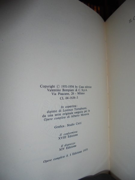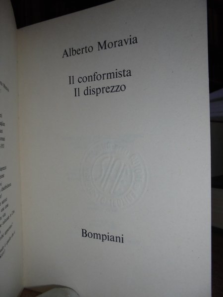 Alberto, Moravia. Il conformista. Il disprezzo. Opere complete 8. Milano Bompiani, 1975. In-8° piccolo, cartoncino edit., 477, (2) pp. Neg. lett. mod. mob. C