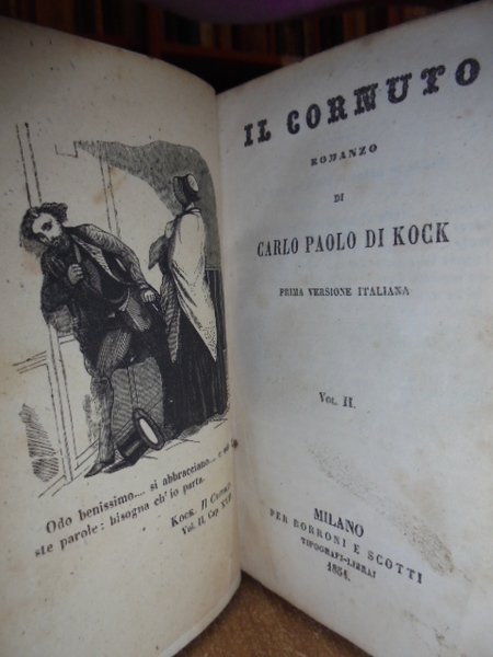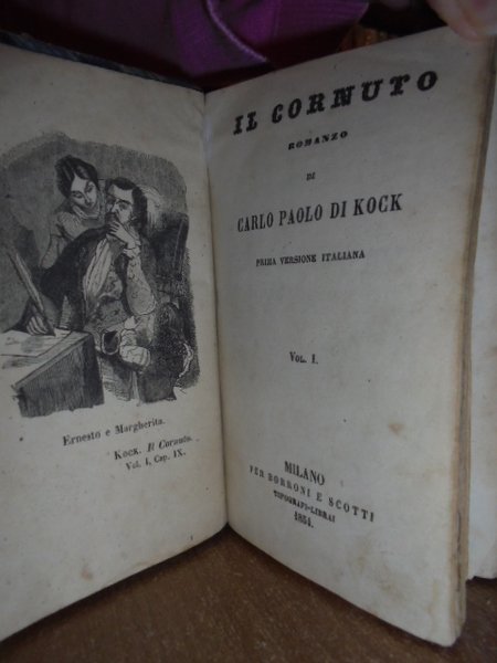 C. Paolo di Kock. Milano, Borroni e Scotti, 1854. Il Cornuto. Prima versione italiana. 3 volumi legati assieme in-16°, m. pelle coeva con titolo in oro al dorso. 141; 169; 161 pp. con 3 antiporte. Segni d' uso alle copertine. Interno ben conservato. Neg. mob. 7.