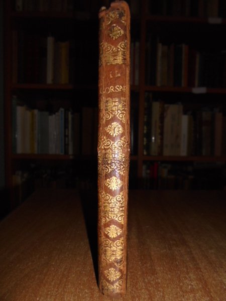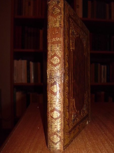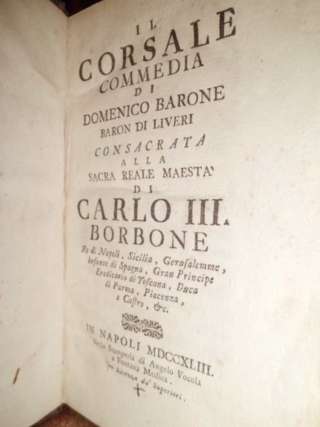 Il Corsale commedia di Domenico Barone Baron di Liveri consacrata alla Sacra Reale Maesta' di Carlo III. Borbone Re di Napoli, Sicilia, Gerusalemme, Infante di Spagna, Gran Principe Ereditario di Toscana, Duca di Parma, Piacenza. Domenico, Barone. In Napoli, Stamperia di Angelo Vocola, 1743. In - 8°, (18,5 x 12 cm.) Bellissima legatura in piena pelle coeva con piatti riquadrati da dentelle, fregi floreali, filetti e piccoli ferri impressi in oro. cc. nn. 3, 192 pp. Rara prima edizione, Allacci cita la seconda edizione del 1744, nel Suppl. / 862.