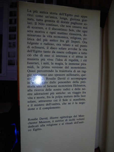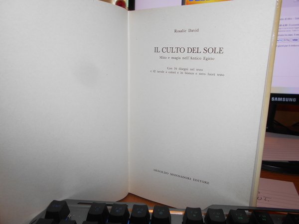 ROSALIE DAVID. Milano, Arnoldo Mondadori Editore, 1981. Il Culto del Sole. Mito e Magia nell' Antico Egitto. In-8° piccolo, tela edit. con titolo in oro sul dorso e sovracopertina ill.a col. 252, (1) pp. con 34 disegni nel testo e 42 tavole a colori e in bianco e nero fuori testo. In ottimo stato di conservazione. Neg. mob. bianco nuovo comput.
