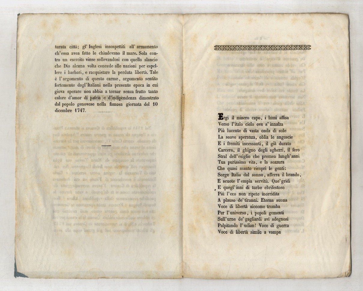 Firenze, Tipografia di Mariano Cecchi, 1848, in-8, br. editoriale celeste, cornice tipografica con eleganti angolari alla copertina anteriore e serto d'alloro alla posteriore, pp. 23, (1). La rievocazione storica della eroica rivolta di popolo a Portoria, in Genova, contro gli invasori austriaci (5-10 dicembre 1747, durante la guerra di successione austriaca) innescata dalla reazione del giovane Giovan Battista Perasso conosciuto come Balilla (citato qui come novello David, ma anche nell'Inno di Mameli) dà spunto all'autore per celebrare l'"amor di patria e d'indipendenza (.) argomento sentito fortemente dagl'Italiani nella presente epoca".