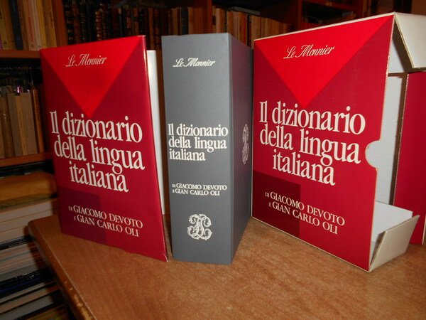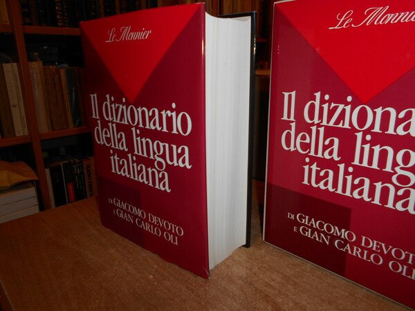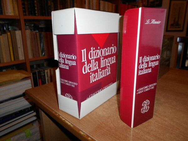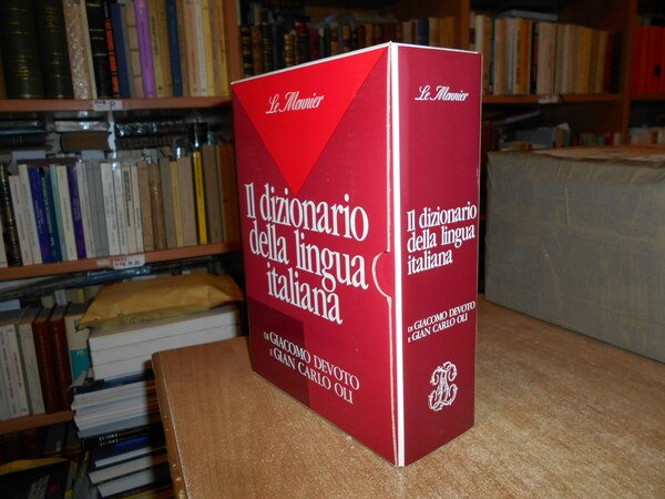 di GIACOMO DEVOTO e GIAN CARLO OLI. Firenze, Le Monnier, 1990. Il Dizionario della lingua italiana. In-8°, cartonato edit. con titolo al dorso, sovracopertina. (viii), 2164 pp. Come nuovo in astuccio editoriale. Uff. stanza TV. mob. fronte nostro