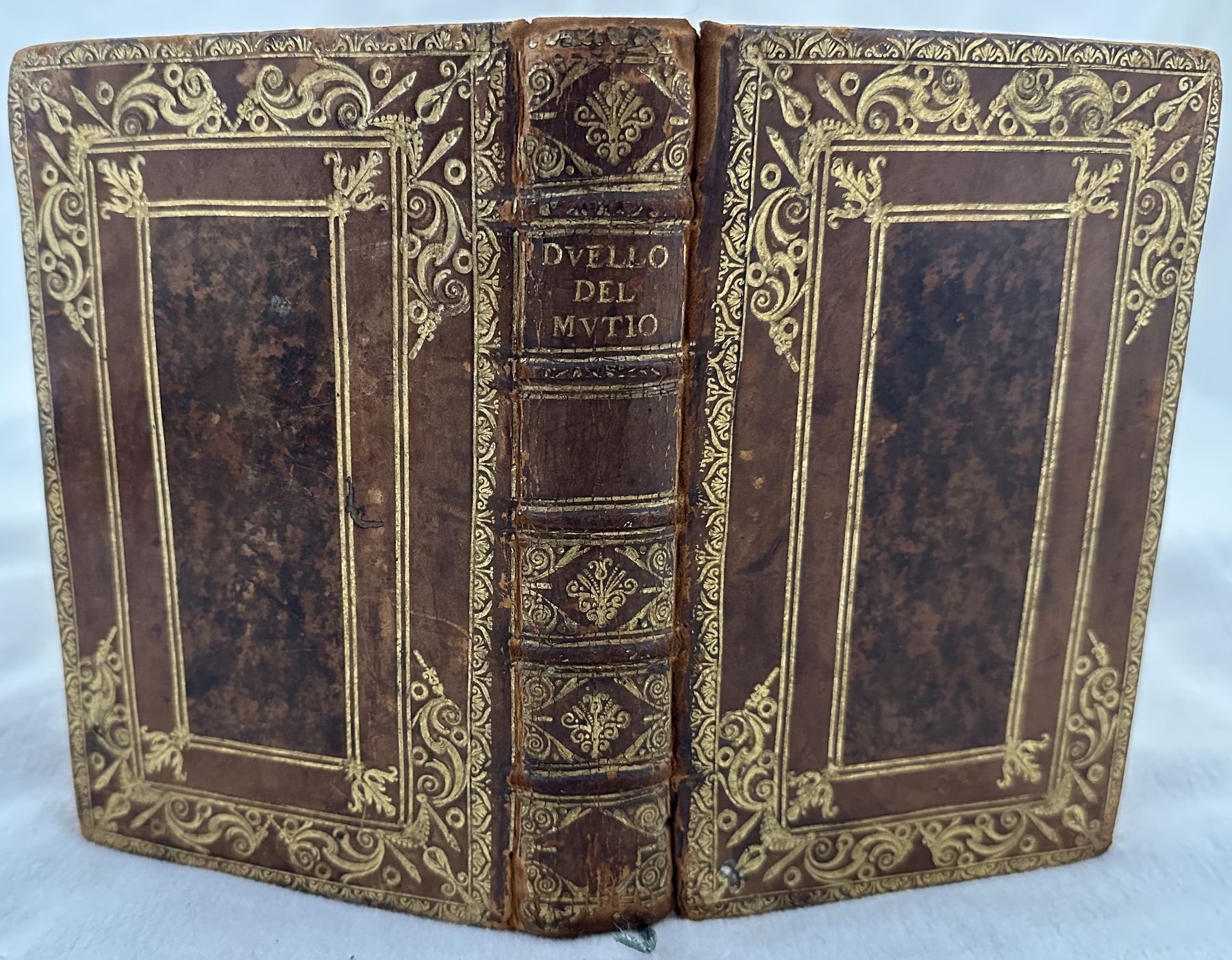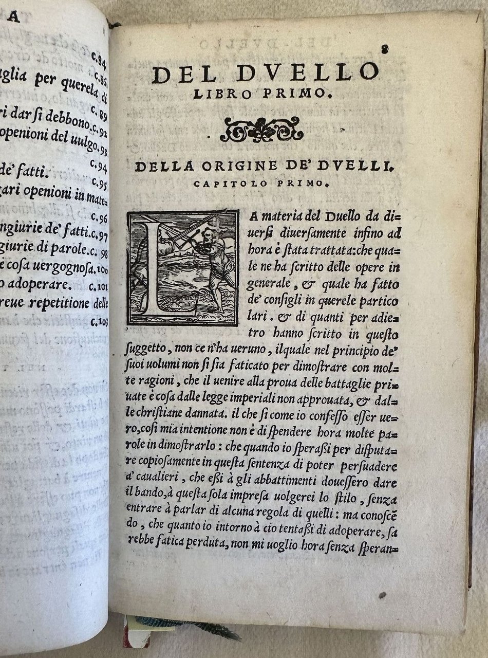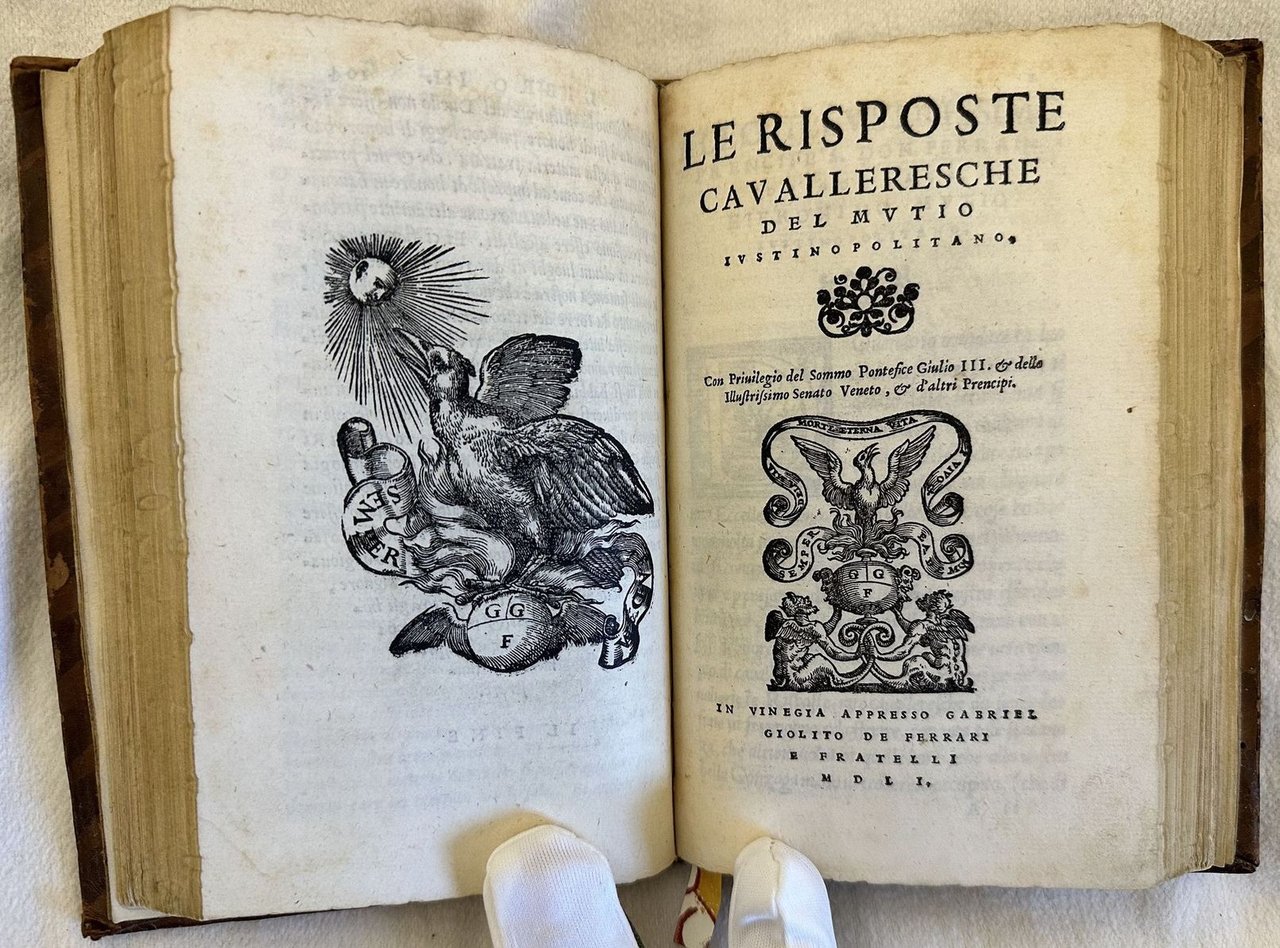 Seconda edizione del 1551 di una delle principali trattazioni rinascimentali sul duello e la sua codificazione scritto da Muzio (Padova 1496-Villa La Paneretta tra Siena e Firenze 1576) detto Giustinopolitano dal paese di origine paterna (Capodistria). Fu letterato e diplomatico per conto di varie corti italiane tra cui quelle di Ferrara, Pesaro e Urbino. L'opera, originariamente pubblicata nel 1550 indaga l'origine e le cause del duello, le tecniche di svolgimento, le tipologie di offesa e di querela, la restituzione dell'onore. A differenza dei comuni trattati sul duello l'autore analizza il duello come strumento di tutela per l'immagine pubblica e il prestigio sociale del Cavaliere. Una parte dedicata ai malefici e incanti, se i bastardi possono muovere duello, del chiamare alla macchia, disuguaglianze dei nobili e prima dei signori ecc. EDIT16 CNCE 54791. Bongi, I 426. Olschki, Choix, 10117. Levi / Gelli, Bibliografia del duello, p.148. D'Ayala, p. 204. Thimm, Fencing and duelling, p 201. Cockle, 879. STC Italian Books, p. 458. Adams, M-2080 (ed. 1550). Unito insieme alla fine del volume l'edizione del 1551 delle "Le risposte cavalleresche del Mutio Iustinopolitano", una serie di risposte dell'autore su fatti di cavalleria realmente accaduti. Vengono trattati temi controversi su duelli e ingiurie ma anche cose curiose (fine del duello dopo la morte del cavallo, "bacchettata a traverso il viso", una bastonata da dietro ecc. Lettere iniziali decorate. Numerazione singola. In ottime condizioni. Copertina in piena pelle con titolo e decorazioni in oro ai piatti e dorso in ottime condizioni generali con lievi usure ai margini e dorso. Legatura in ottime condizioni. Pagine in buone condizioni con rare fioriture. Decorazioni a secco ai tagli. In 16. cm 16,5x11,5. Pp. 104, 119+(1). Second edition of 1551 of one of the most important Rinascimento treatise about duel and its codification written by Muzio (Padova 1496-Villa La Paneretta tra Siena e Firenze 1576) also known as Giustinopolitano originated from (Capodistria)He was man of letters and diplomat in different courts as Ferrara, Pesaro and Urbino. The work, originally published in 1550 treats the origins and causes of duel, techniques, different kind of offences, restitution of the honour. The author does not treat duel in the giuridic form but considers duel as a form of honour. EDIT16 CNCE 54791. Bongi, I 426. Olschki, Choix, 10117. Levi / Gelli, Bibliografia del duello, p.148. D'Ayala, p. 204. Thimm, Fencing and duelling, p 201. Cockle, 879. STC Italian Books, p. 458. Adams, M-2080 (ed. 1550). Bound at the end of the volume the edition of 1551 of "Le risposte cavalleresche del Mutio Iustinopolitano", a series of answers of the author aboutt real facts of chevalry. Treatment of controversial themes and curious happenings. Decorated capital letters Singole numbering. In very good conditions. Full leather cover with gilted title and decorations in the spine and plates in very good conditions lightly worn with lackings in the extremities. Binding in very good conditions. Inside pages are in good conditions with occasional foxing. Embossed decorations in the external edges of pages. In 16. cm 16,5x11,5. Pp. 104, 119+(1).<BR><BR>