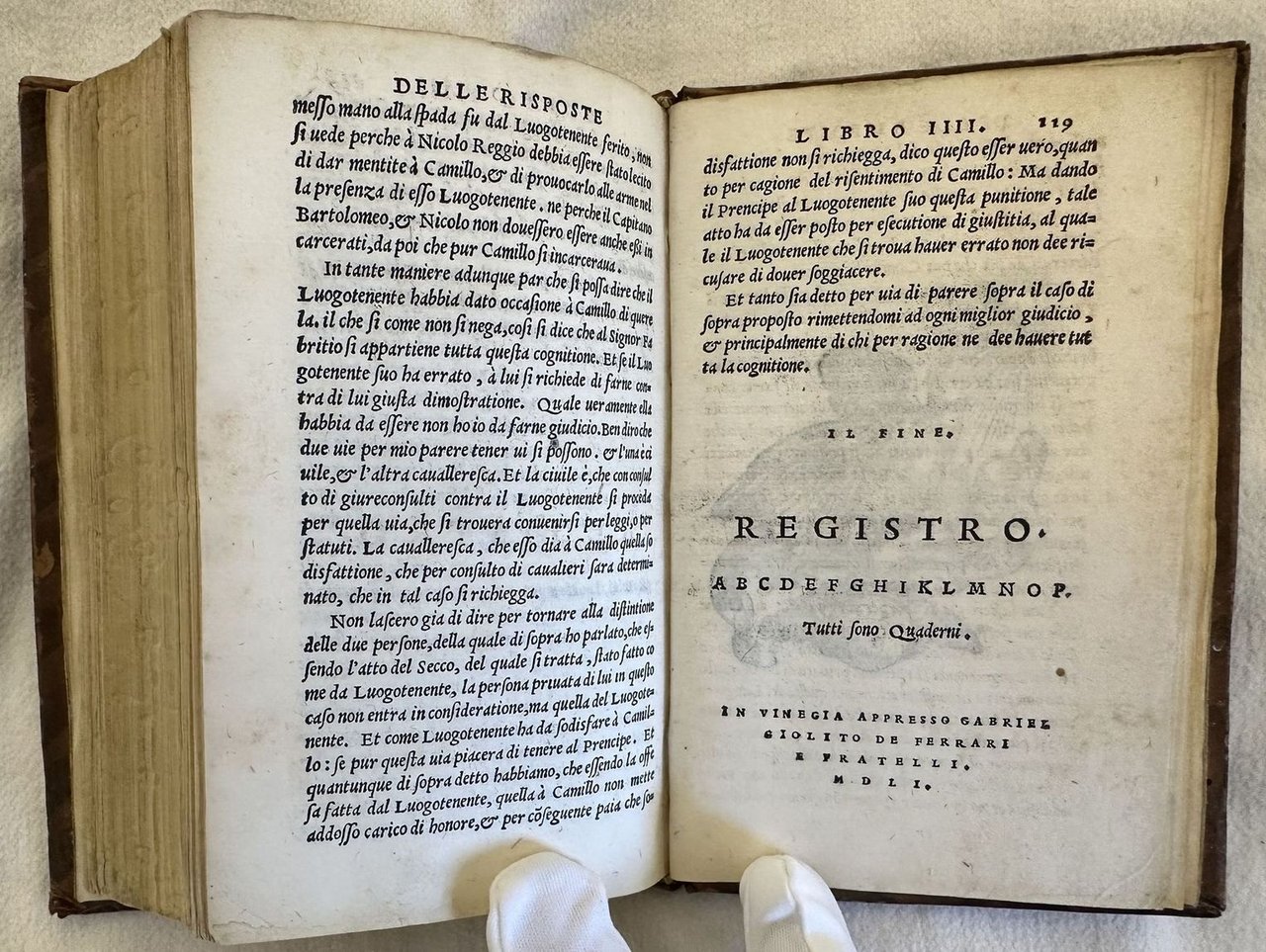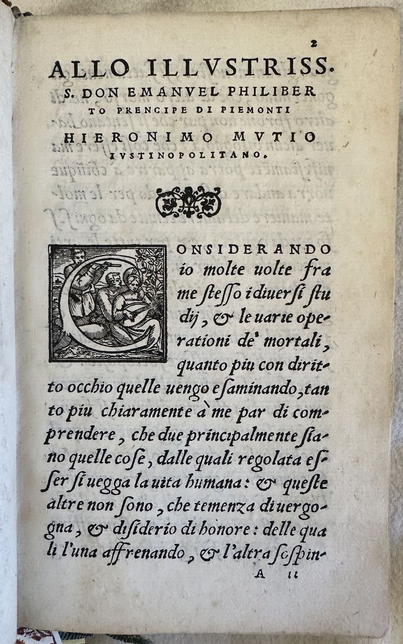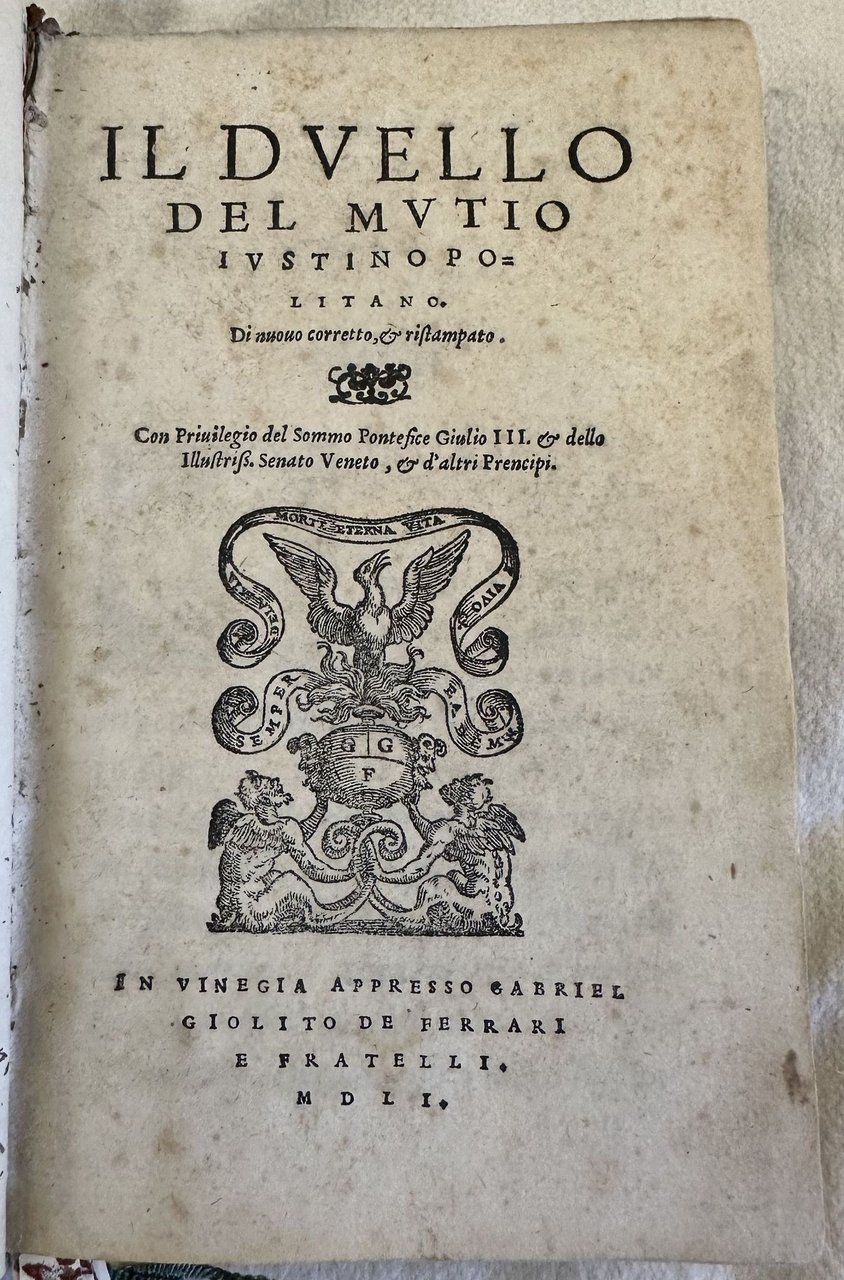 Seconda edizione del 1551 di una delle principali trattazioni rinascimentali sul duello e la sua codificazione scritto da Muzio (Padova 1496-Villa La Paneretta tra Siena e Firenze 1576) detto Giustinopolitano dal paese di origine paterna (Capodistria). Fu letterato e diplomatico per conto di varie corti italiane tra cui quelle di Ferrara, Pesaro e Urbino. L'opera, originariamente pubblicata nel 1550 indaga l'origine e le cause del duello, le tecniche di svolgimento, le tipologie di offesa e di querela, la restituzione dell'onore. A differenza dei comuni trattati sul duello l'autore analizza il duello come strumento di tutela per l'immagine pubblica e il prestigio sociale del Cavaliere. Una parte dedicata ai malefici e incanti, se i bastardi possono muovere duello, del chiamare alla macchia, disuguaglianze dei nobili e prima dei signori ecc. EDIT16 CNCE 54791. Bongi, I 426. Olschki, Choix, 10117. Levi / Gelli, Bibliografia del duello, p.148. D'Ayala, p. 204. Thimm, Fencing and duelling, p 201. Cockle, 879. STC Italian Books, p. 458. Adams, M-2080 (ed. 1550). Unito insieme alla fine del volume l'edizione del 1551 delle "Le risposte cavalleresche del Mutio Iustinopolitano", una serie di risposte dell'autore su fatti di cavalleria realmente accaduti. Vengono trattati temi controversi su duelli e ingiurie ma anche cose curiose (fine del duello dopo la morte del cavallo, "bacchettata a traverso il viso", una bastonata da dietro ecc. Lettere iniziali decorate. Numerazione singola. In ottime condizioni. Copertina in piena pelle con titolo e decorazioni in oro ai piatti e dorso in ottime condizioni generali con lievi usure ai margini e dorso. Legatura in ottime condizioni. Pagine in buone condizioni con rare fioriture. Decorazioni a secco ai tagli. In 16. cm 16,5x11,5. Pp. 104, 119+(1). Second edition of 1551 of one of the most important Rinascimento treatise about duel and its codification written by Muzio (Padova 1496-Villa La Paneretta tra Siena e Firenze 1576) also known as Giustinopolitano originated from (Capodistria)He was man of letters and diplomat in different courts as Ferrara, Pesaro and Urbino. The work, originally published in 1550 treats the origins and causes of duel, techniques, different kind of offences, restitution of the honour. The author does not treat duel in the giuridic form but considers duel as a form of honour. EDIT16 CNCE 54791. Bongi, I 426. Olschki, Choix, 10117. Levi / Gelli, Bibliografia del duello, p.148. D'Ayala, p. 204. Thimm, Fencing and duelling, p 201. Cockle, 879. STC Italian Books, p. 458. Adams, M-2080 (ed. 1550). Bound at the end of the volume the edition of 1551 of "Le risposte cavalleresche del Mutio Iustinopolitano", a series of answers of the author aboutt real facts of chevalry. Treatment of controversial themes and curious happenings. Decorated capital letters Singole numbering. In very good conditions. Full leather cover with gilted title and decorations in the spine and plates in very good conditions lightly worn with lackings in the extremities. Binding in very good conditions. Inside pages are in good conditions with occasional foxing. Embossed decorations in the external edges of pages. In 16. cm 16,5x11,5. Pp. 104, 119+(1).<BR><BR>