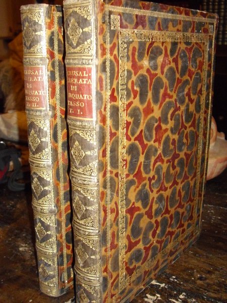 2 VOLUMI IN - 4°, PIENA PELLE COEVA MACULATA ARTISTICAMENTE, DORSO A 5 NERVI CON DECORAZIONI IN ORO E AMPI RIQUADRI SUI PIANI, TAGLIO ROSSO. XXX, 364; XII, 360 PP. CON GRANDE ANTIPORTA ALLEGORICA, RITRATTO DEL TASSO, 95 VIGNETTE E ARTISTICHE BORDURE ORNAMENTALI N.T. E 20 MAGNIFICHE TAVOLE F.T. DISEGNATE DA BERNARDO CASTELLI INCISE IN RAME DA GIACOMO LEONARDIS. UNA DELLE EDIZIONI PIÙ BELLE DALLA GERUSALEMME LIBERATA, IMPREZIOSITA DA UN' ECCEZIONALE LEGATURA DI INCREDIBILE BELLEZZA. ESEMPLARE PERFETTAMENTE CONSERVATO. COHEN - RICCI, 980. GAMBA, P. 285. MORAZZONI, P. 228. GASPARRINI - LEPORACE, 71.