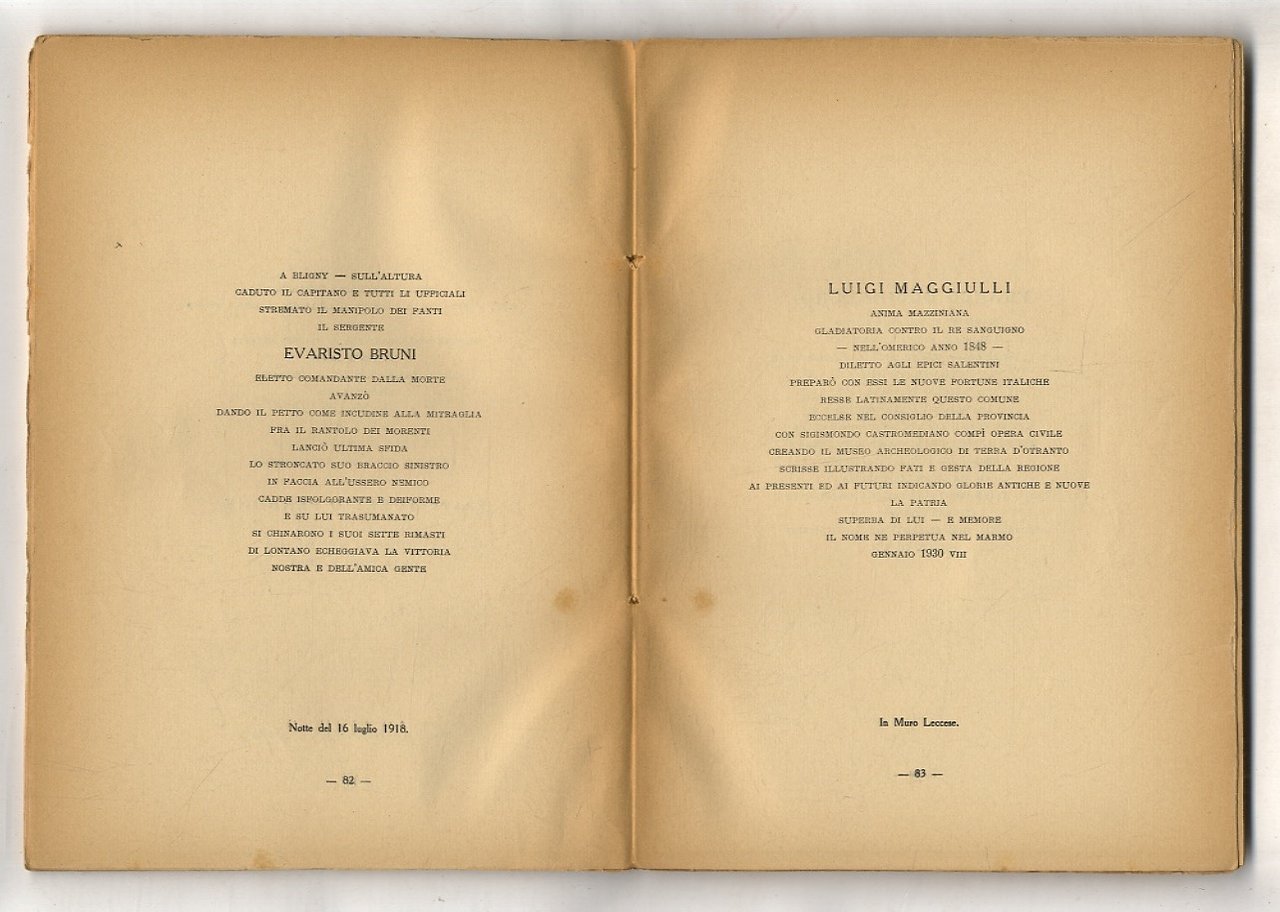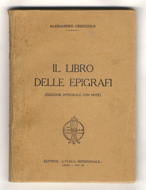 Lecce, Editrice "L'Italia Meridionale", 1933, in-8, br. editoriale, pp. 215, (3). Con ritratto in antiporta e note storiche e biografiche. Dorso rifatto. Timbro: Ingg. Natale e D'Ippolito, Taranto. Prima edizione.
