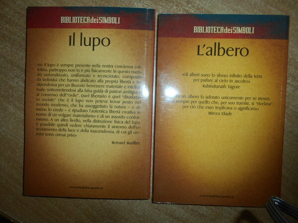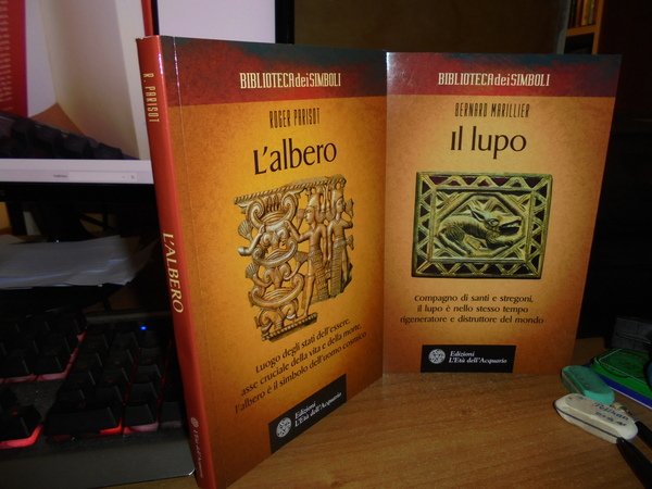 Bernard Marillier. Roger Parisot. Torino, Edizioni L' Età dell' Acquario, 2008. 2 volumi in-8°, cartoncino plastificato con risvolti. Il Lupo. Compagno di Santi e Stregoni, il lupo è nello stesso tempo rigeneratore e distruttore del mondo. 219, (2) pp. con alcune ill. a col. in tavole f.t.; L' Albero. Luogo degli stati dell' essere, assecruciale della vita e della morte, l' albero è il simbolo dell' uomo cosmico. 152, (2) pp. con numerose illustrazioni anche a colori in tavole f.t. In stato di nuovi. Uff. stanzetta mob. a sinistra sotto finestra entro busta trasp.