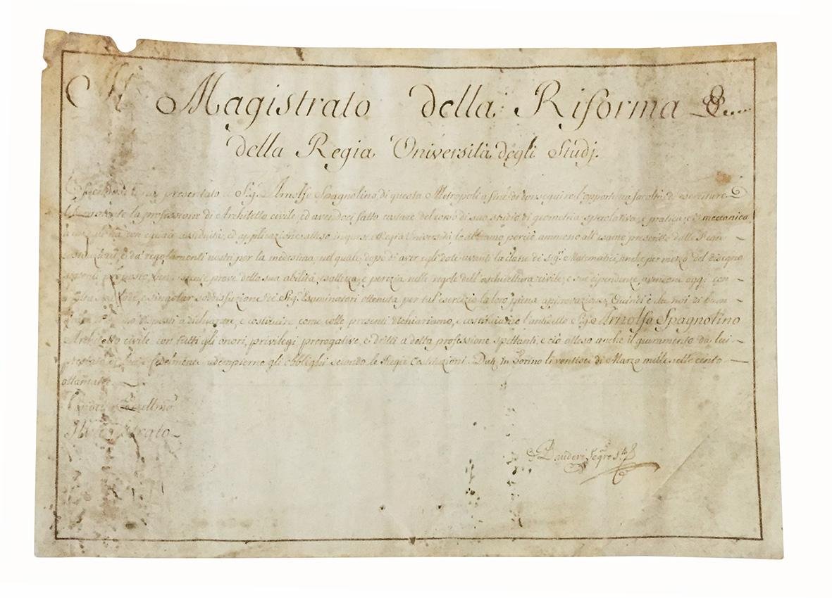 Laurea in architettura del pittore, incisore ed architetto Arnolfo Spagnolini, nato nel 1764 e documentato come attivo fino al 1829 circa.