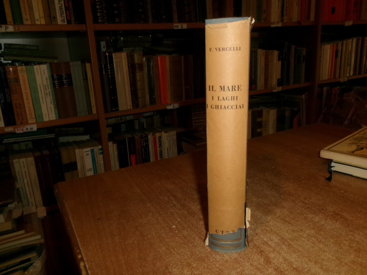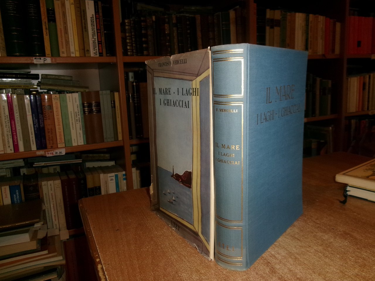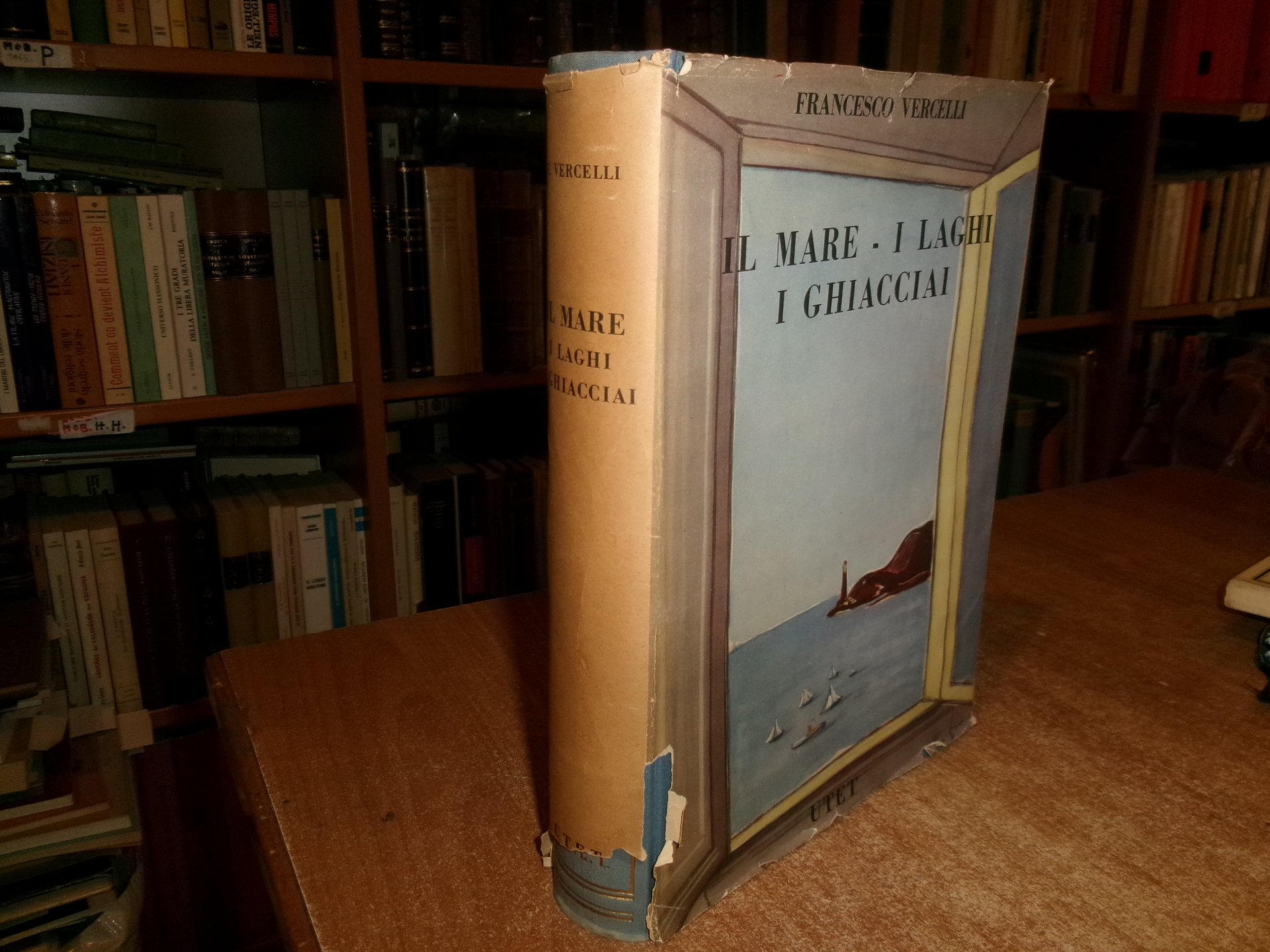 Francesco Vercelli. Torino, U.T. E. T., 1951. IL MARE - I LAGHI - I GHIACCIAI. In-8°, tela edit. azzurra con titoli in oro, sovracopertina ill. a col. (con strappi e mancanze). xvi, 622 pp. con 6 cartine a colori fuori testo e 500 figure nel testo. Il libro è classificato in buono stato di conservazione perchè la sovracopertina presenta strappi e mancanze come da foto ma il libro è in ottimo stato. Neg. mob nat. 22