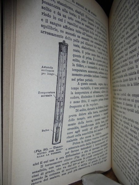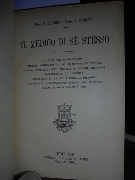 SOCCORSI IMMEDIATI IN CASO DI CONTUSIONI, FERITE, USTIONI, AVVELENAMENTI, ASFISSIA E MALORI IMPROVVISI; MALATTIE LE PIÙ COMUNI; ASSISTENZA AL MALATO E CONSIGLI IGENICI; GRAVIDANZA, ALLATTAMENTO, INNESTO DEL VAIOLO; MALATTIE DELL' INFANZIA, ETC. IN-8°, M. TELA CON TITOLO IN ORO SUL DORSO CON NUMEROSE ILLUSTRAZIONI NEL TESTO. 240 PP. IN OTTIMO STATO DI CONSERVAZIONE. Neg. med. mob. G