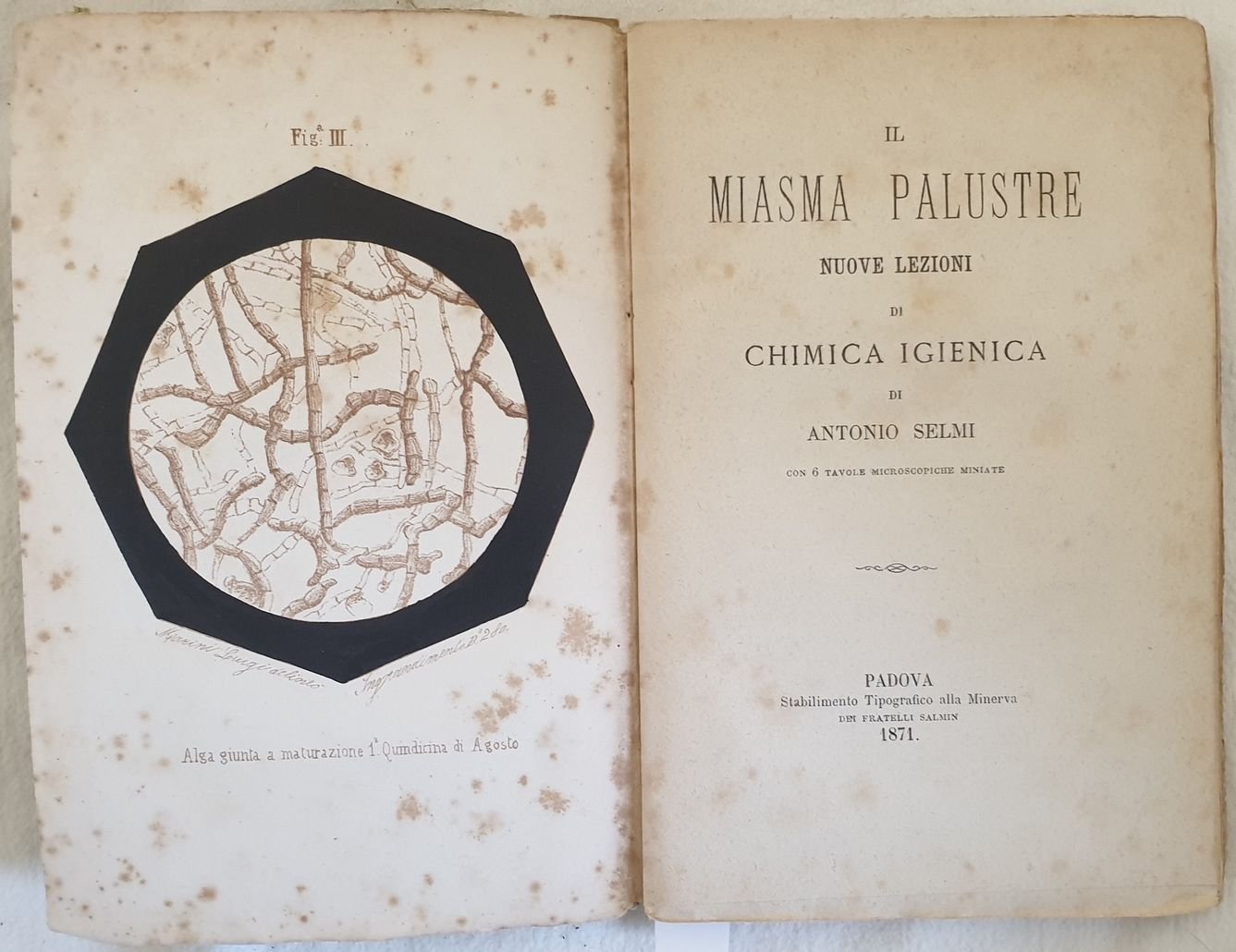 Curiosa pubblicazione sui batteri che si sviluppano a causa del miasma palustre scritto da Antonio Selmi. All'interno sono presenti sei tavole di vetrini di alghe in una soluzione di chinina e il loro sviluppo. In buone condizioni. Copertina editoriale in buone condizioni generali con lievi usure marginali. Dorso coperto da carta e piatto posteriore assente. Legatura in buone condizioni. All'interno le pagine si presentano in buone condizioni con rare fioriture. In 8. Dim. 25x17,5 cm. Pp. 142+(1). Curious pamphlet about bacteria which develop due to swamp stick written by Antonio Selmi. Insdie there are six plates of seaweed coltua in a solution of chinina and their development. In good conditions. Editorial cover in good general conditions lightly worn in the extremities. Spine is covered with paper and back plate lacks. Binding in good conditions. Inside pages are in good conditions with occasional foxing. In 8. Dim. 25x17,5 cm. Pp. 142+(1).