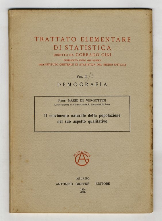 Milano, Antonino Giuffrè, 1934, in-8, br. editoriale, pp. [4], 68. Estratto dal volume intitolato "Demografia" del "Trattato elementare di statistica diretto da Corrado Gini".