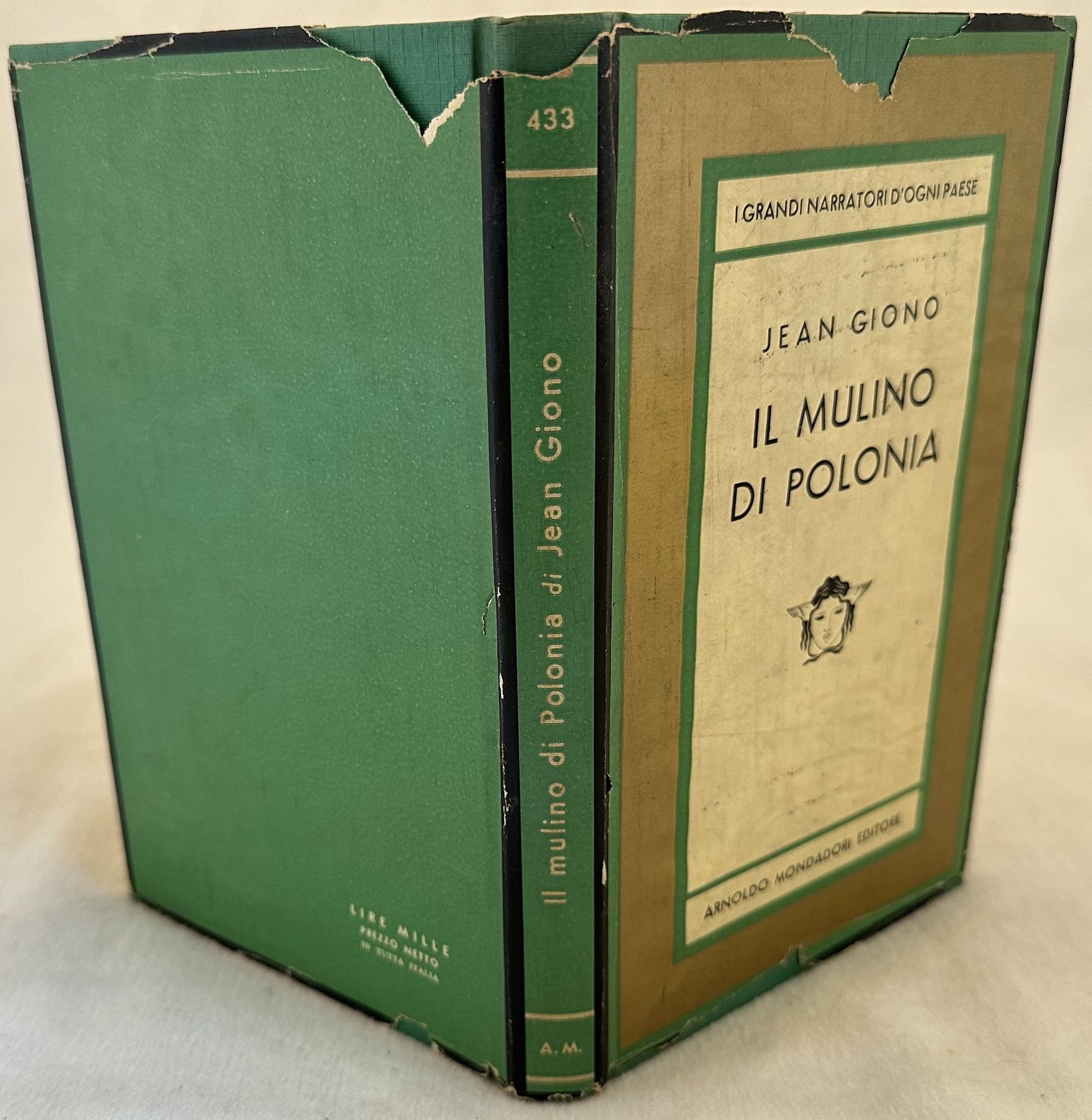 Prima edizione italiana del 1960 del romanzo "Il mulino di Polonia" (Titolo originale "Le moulin de Pologne") della scrittrice francese Jean Giono (1895-1970). Volume numero 433 della collana "Medusa". In discrete condizioni. Copertina editoriale con sovraccoperta in buone condizioni generali con lievi usure ai margini e dorso. Sovraccoperta con usure e mancanze. Legatura in buone condizioni. Pagine in discrete condizioni con fioriture. Lievi gore d'umidità marginali. In 8. cm 19,5x12,5. Pp. 189+(1).First italian edition of 1960 of the novel "Il mulino di Polonia" (Original title "Le moulin de Pologne") by the french writer Jean Giono (1895-1970). Volume number 433 of the series "Medusa". In fair conditions Editorial cover with dustjacket in good conditions lighttle worn in the extremities. Dustjacket with wearings and lackings. Binding in good condition. Pages in fair conditions with foxing. Light dump stains in the edges. In 8. cm 19,5x12,5. Pp. 189+(1).