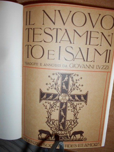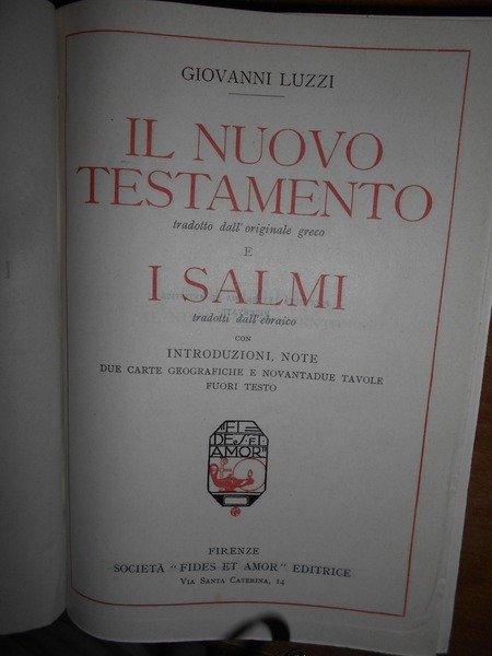 Giovanni, Luzzi. Firenze, Società "Fides et Amor" Editrice, 1930. Il Nuovo Testamento tradotto dall'originale greco e i Salmi tradotti dall' ebraico con introduzioni e note due carte geografiche ripiegate e novantadue tavole fuori testo. In-8°, legatura nuova in tutta tela con titolo in oro entro tassello al dorso, brossure originali conservate. xli, 1361 pp. In ottimo stato di conservazione o come nuovo (legatura nuova in tela e copertine originali conservate. Uff. TV. mob. nostro. Neg. mob. rosso