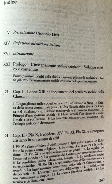 I. Pio X e l'idea cristiana di civilizzazione: 1. Ignis ardens e Iskra - 2. Il Sillon o la politica come religione - 3. Benedetto XV, la guerra e la rivoluzione - II. Pio XI e la spiritualizzazione del politico: 4. La regalità del Cristo nel mondo - 5. La sovranità del Cristo come progetto possibile 6. Le condizioni etiche; educazione, famiglia - 7. Le condizioni sociali ed economiche -III Pio XII e la spiritualizzazione della vita economica e sociale: 8. La legge naturale come criterio universale - 9. Cristianesimo e democrazia 10. L'avvenire cristiano dell'Europa - 11. Condizioni per una comunione di popoli - 12. La società pluralista possibile - 13. Età tecnica e civilizzazione umana.